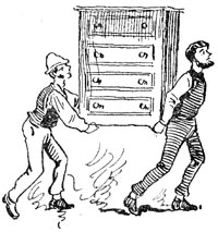 Now the chemist was just trying to find out something which should turn everything it touched into gold; and he had a large glass bottle into which he put all kinds of gold and silver, and many other valuable things, and melted them all up over the fire, till he had almost found what he wanted. He could turn things into almost gold. But just now he had used up all the gold that he had round the house, and gold was high. He had used up his wife's gold thimble and his great-grandfather's gold-bowed spectacles; and he had melted up the gold head of his great-great-grandfather's cane; and, just as the Peterkin family came in, he was down on his knees before his wife, asking her to let him have her wedding-ring to melt up with all the rest, because this time he knew he should succeed, and should be able to turn everything into gold; and then she could have a new wedding-ring of diamonds, all set in emeralds and rubies and topazes,[15] and all the furniture could be turned into the finest of gold.
