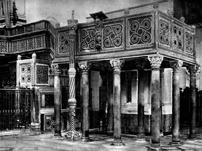 The two pulpits and that in the choir in front of the archbishop's throne, which are said to have been executed by order of John of Procida, are fine examples of the rich mosaic work of the period. The two large pulpits are placed in the nave, before the choir, which here has retained its original position in front of the high altar. Stairs opening out of the choir, finely decorated in mosaic, lead to each pulpit. In front of the larger one on the right is a fine Paschal candelabrum, decorated in mosaic. The pulpit itself is supported on twelve granite columns, while the four supports of the opposite ambo are the very rare black porphyry called Porfido Nero-Bianco. The raised space between is paved in Opus Alexandrinum.
