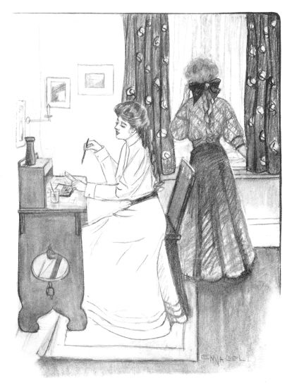 During the next week this thought recurred to her more than once. By means of some diplomatic maneuvering, the two friends managed to have their single rooms exchanged for a double. After moving in, Lila seized a moment of solitude to plan a beautiful cozy corner for Bea. She dragged her own desk into a dusky recess and set Bea’s at an artistic 18 angle at the left side of the sunniest window. Just as she was hanging her favorite picture above it, Bea came rushing in with her arms full of new books.