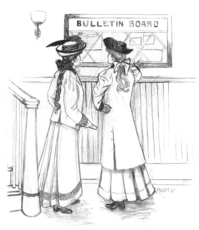 “They’ve come! They’re here! The Board of Editors is going to meet in the lecture room immediately to open the boxes. Four big beautiful boxes full of splendid great books all in green with gilt lettering. Hurry! Hurry quick yourself! You’re head literary editor. It’s really your book—the ideas, editorials, verses, farce, everything! The sale opens at five. Everybody’s crazy to see the new senior Annual. Our Annual! Oh, Berta!” She seized the taller girl around the waist and whirled her down the hall till loose sheets of paper from her dangling note-book flitted merrily hither and yon.