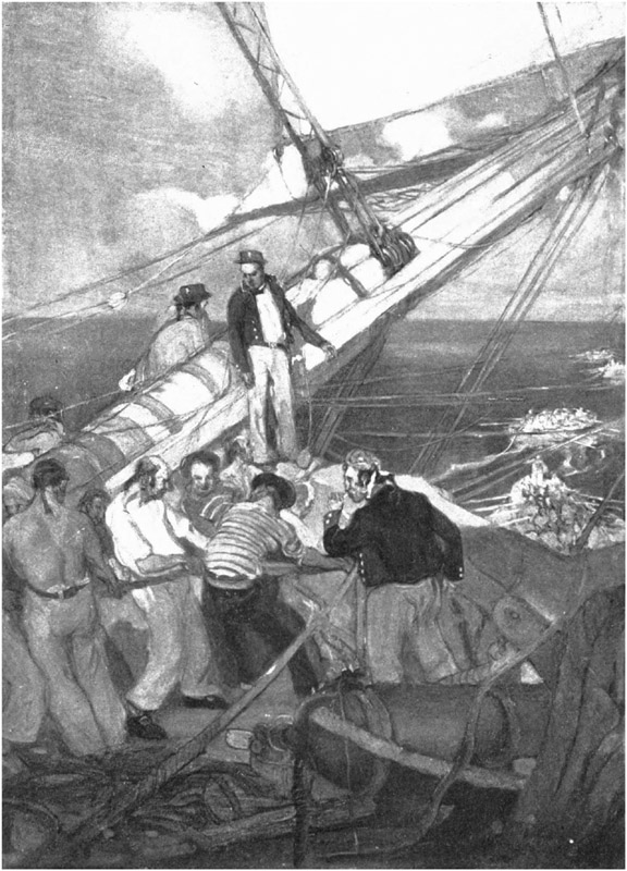It still blowing strong from the westward, with a heavy sea, Captain Jones, being to windward, and so having the choice of attacking, first put his ship under close-reefed topsails, and then stood down for the "Frolic," which hauled to the wind on the port tack—that is, with the wind on the left side—to await the enemy. The British brig was under the disadvantage of having lost her main-yard in the same gale that cost the American her jib-boom; she was therefore unable to set any square sail on the rearmost of her two masts. The sail called the boom mainsail in part remedied this, so far as enabling the brig to keep side to wind; but, being a low sail, it did not steady her as well as a square topsail would have done in the heavy sea running, a condition which makes accurate aim more difficult.
