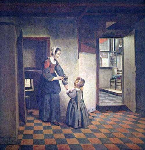 Van der Meer had a way of catching people without their knowing it. He seems to have cut a piece out of the wall where he peeped in and painted what he saw. We are glad the girl left the door open into another room so that we can see the table and pictures and part of the window-frame. I think these things are reflected in a looking-glass.
