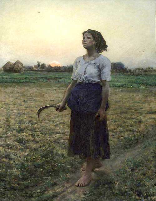 an you not almost hear this girl singing? The sun is just coming up. The lark is rising in the sky, singing! The girl has come out to work in the fields; a peasant girl. Barefooted, barehanded, she stands straight like a soldier of work with her head lifted to drink in the morning air as she sings.