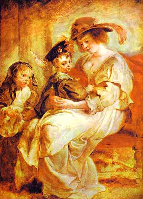 his picture of "Helena Fourment Rubens and Her Son and Daughter" was really painted to honor the boy. It has always been the custom in Europe to pay special attention to the boys in the home and keep the girls very much in the background. It is very easy to see how pert the little Albert Rubens is, and how subdued and meek is his sister. The boy has the "Lord of Creation" air that would not be good for him in America. We love the picture, for Rubens, the father, shows us plainly the old idea that the boy rules the home. Naturally the father would know the traits of his own children but not always would he allow us to know them too.