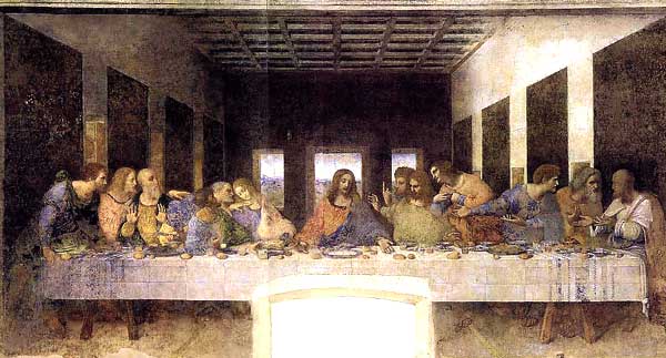We shall begin in the center of the table and name the disciples as Leonardo has them in the picture. First is the Savior. At his left is James with his arms spread out in distress; back of him is Thomas with his finger uplifted; then Philip rising with his hand on his heart; next Matthew, his arms pointing to the Savior while he turns toward the two near the end; next to him is Thaddeus; and then Simon. On the other side of Jesus sits John, the beloved disciple. His hands are folded and his eyes are cast down. Next to John is Judas, the betrayer; he holds the bag clutched in his right hand and near him is the overturned salt cellar. Leaning back of Judas is Peter with one hand on John's shoulder; next to Peter is Andrew; then James, the less, laying one hand on Peter's arm. At the end of the table is Bartholomew, who has risen resting his hands on the table. These men are all asking, "Is it I?" For Jesus had said, "He it is to whom I give a sop."[81]