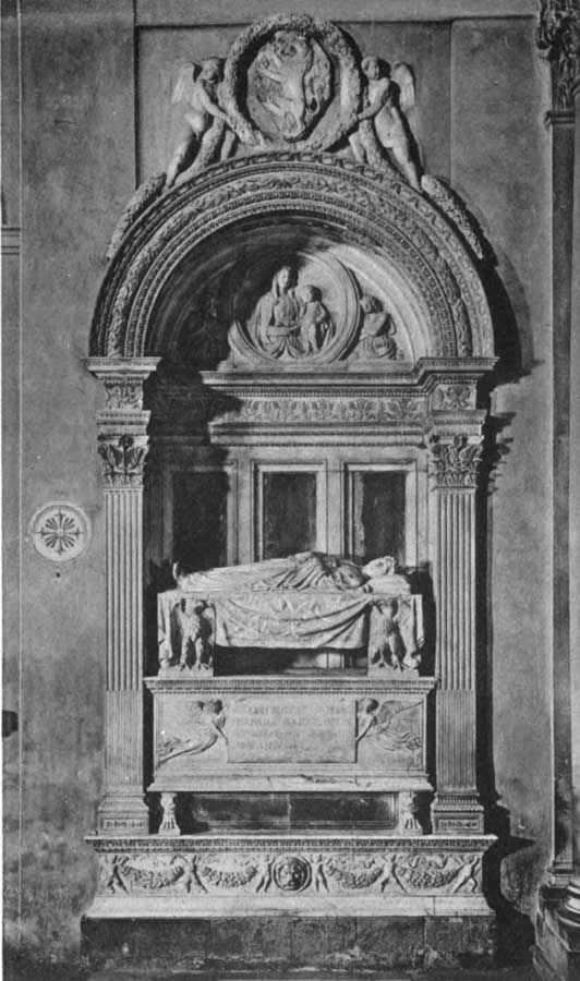There were wanting at this time in Rome some of those large figures[Pg 268] of the Apostles which generally stood on the altar of the Chapel of the Pope, as well as certain other works in silver that had been destroyed; wherefore Pope Sixtus sent for Andrea and with great favour commissioned him to do all that was necessary in this matter, and he brought the whole to perfection with much diligence and judgment. Meanwhile, perceiving that the many antique statues and other things that were being found in Rome were held in very great esteem, insomuch that the famous bronze horse was set up by the Pope at S. Giovanni Laterano, and that even the fragments—not to speak of complete works—which were being discovered every day, were prized, Andrea determined to devote himself to sculpture. And so, completely abandoning the goldsmith's art, he set himself to cast some little figures in bronze, which were greatly extolled. Thereupon, growing in courage, he began to work in marble. Now in those days the wife of Francesco Tornabuoni had died in childbirth, and her husband, who had loved her much, and wished to honour her in death to the utmost of his power, entrusted the making of a tomb for her to Andrea, who carved on a slab over a sarcophagus of marble the lady herself, her delivery, and her passing to the other life; and beside this he made three figures of Virtues, which were held very beautiful, for the first work that he had executed in marble; and this tomb was set up in the Minerva.