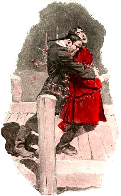 "Fool!" cried the other, hardly giving him time to end. "Do you, then, think that I have time to chatter with you while two villains are lying in wait for me, perhaps at the very door? Blame your own self for your death!" And, gnashing his teeth with an indescribable menace, and resting his hand upon the table, he vaulted with incredible agility clean across it and upon our hero, who, entirely unprepared for such an extraordinary attack, was flung back against the wall, with an arm as strong as steel clutching his throat and a knife flashing in his very eyes with dreadful portent of instant death.