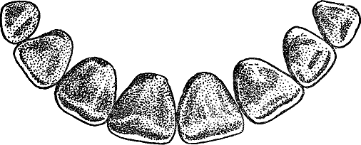 Fig. 5.—Internal face of incisors at 5 years.At 5 to 6 years there is a leveling of the permanent pinchers, the pinchers usually being leveled at six and both pairs of intermediates partially leveled and the corner incisors showing wear.