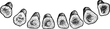 After 6 years the arch gradually loses its rounded contour and becomes nearly straight by the twelfth year. In the meantime the teeth have gradually become triangular in shape, distinctly separated, and show the progressive wearing to stubs.