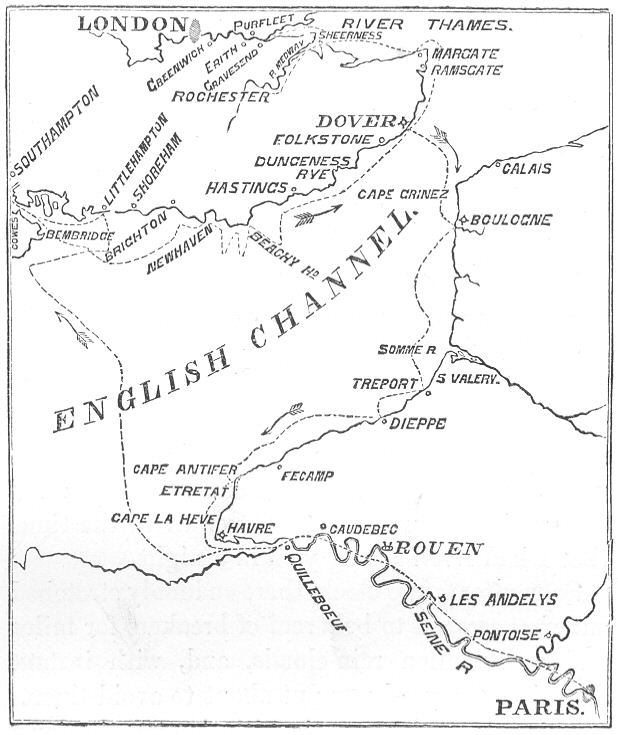 [52] “Caution.—During strong winds, between W.S.W., round westerly, and N.N.W., the coast to the eastward of Ailly Point is dangerous to be on, and shipwrecks are of frequent occurrence; vessels therefore of every description at that period should keep a good offing, and when obliged to approach it, must do so with great caution; for although the general mass of the above banks appear to be stationary, yet great attention must be paid to the lead, and in observing the confused state of the sea in the various eddies, so as to guard against suddenly meeting with dangers which may be of recent formation. The lights for the purpose of pointing out the position of the headlands and dangers between Capes Antifer and Gris-Nez at night, are so disposed that in clear weather two can always be seen at a time, and the greater number of the harbours have one or more tide lights shown during the time the harbour can be entered.