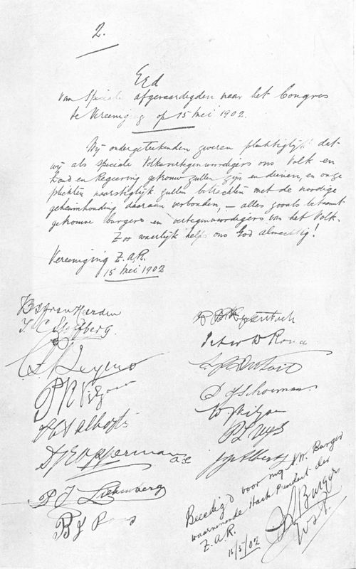 Acting President Burger signed. After him the members of the Government of the South African Republic. Then Acting President de Wet and the Members of the Orange Free State Government. Lord Kitchener followed, and last of all Lord Milner signed.