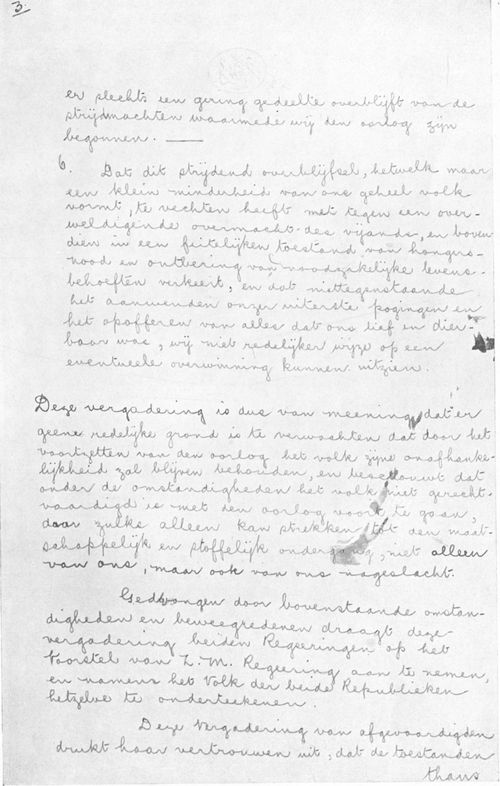 "6. That this struggling remnant, which constitutes only a small minority of our entire people, has to fight against overwhelming odds of the enemy, and is, moreover, practically in a state of famine and privation, wanting even the indispensable necessaries of life, and that in spite of the application of our utmost endeavours and the sacrifice of all that was dear and precious to us, we cannot reasonably expect ultimate victory.