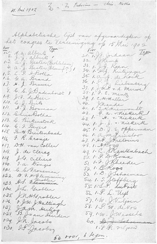 General Botha: I think we must adopt General de Wet's suggestion. We have fought and suffered together; let us now decide together. In this matter we can and must devise means to be unanimous.