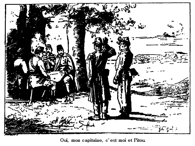 Que faire? se sauver? Pas facile, quand on traîne derrière soi des femmes, des enfants, des vieillards et des troupeaux de moutons. C'est pour le coup qu'ils regrettèrent bien d'avoir eu l'idée de faire une razzia chez les Beni-Okbah. Enfin l'un d'eux, qui était jeune mais qui n'était pas bête, proposa de s'adresser aux Roumis et surtout au capitaine Chambard, homme fameux et bon enfant, celui-là, qui ferait une battue avec ses hommes et mettrait tous les lions du pays en chair à pâté. On l'écouta et l'on envoya deux députés au capitaine Chambard.