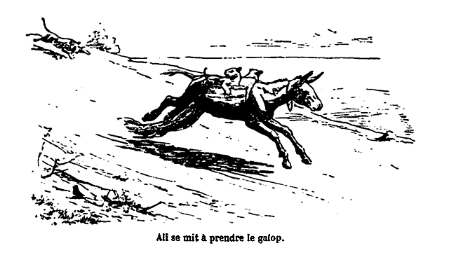 Pendant ce temps, l'Arabe glissa dans le chemin, comme un éclair, et siffla le bourricot.