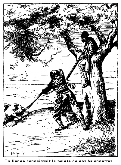 Elle devint si furieuse qu'elle bondit sur nous, malgré nos baïonnettes, et manqua de s'embrocher toute vive. Malheureusement, c'est ma broche qu'elle rencontra, qui glissa le long de son flanc et s'enfonça dans sa cuisse, mais sans entrer profondément, parce que la lionne recula vivement, comme vous pouvez croire, quand elle en sentit la pointe.