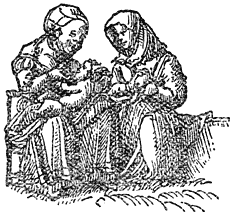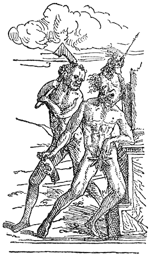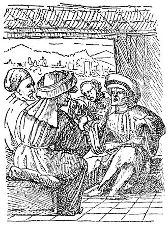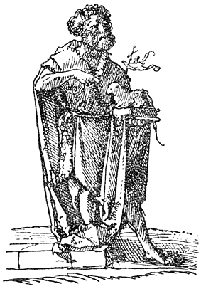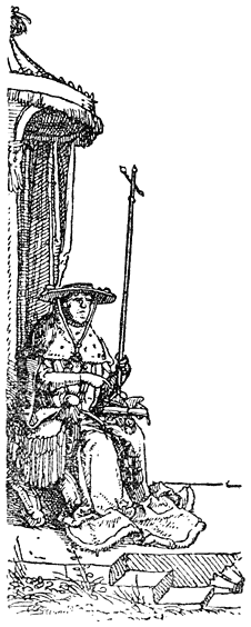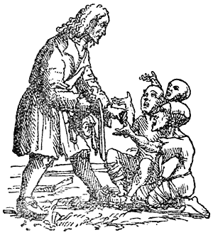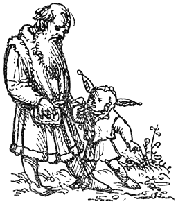 Een enkel woord over de in deze uitgave opgenomen penteekeningen van Holbein: Hans Holbein, de jongere, 1497–1543, woonde gedurende de eerste jaren van zijn werkzaamheid in Bazel, waar Erasmus zich met voorliefde placht op te houden en waar hij ook gestorven is. In een exemplaar van “de Lof der Zotheid,” door den Bazelschen drukker Froben in 1514 uitgegeven, dat voor Erasmus persoonlijk bestemd was, heeft Holbein—die met Erasmus op goeden voet stond—op den rand der bladzijden een aantal geestige illustraties aangebracht. Het boek berust thans in het museum van Bazel. Aan dit werk heeft de schilder, zooals uit een aanteekening op een blad van het exemplaar blijkt, slechts tien dagen besteed. En zoo heeft hij natuurlijk niet zorgvuldig gewikt en gewogen, wat van den inhoud meer in het bijzonder in aanmerking kwam [8]om te worden in beeld gebracht, maar slechts de voorstelling, die een woord of zegswijze voor zijn schildersoog deed oprijzen, met losse hand op het papier geworpen. Vandaar, dat de plaatjes2 dikwijls zoo ongelijkmatig zijn verdeeld. Een enkele maal zelfs bekommert Holbein zich in het geheel niet om den tekst, maar illustreert den commentaar van Listrius, die ook in bovengenoemd exemplaar was afgedrukt.