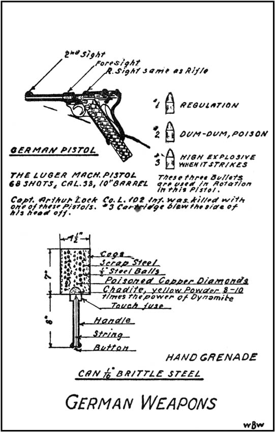 A hand grenade was used by them which our boys called potato-mashers. The head of the potato-masher was a can made of one-sixteenth-inch brittle steel. The can was about seven inches long by four and one-half inches in diameter. Around the inside of the can was a layer of small steel cogs. Inside these a layer of small steel balls. The next layer was of small ragged-edged scrap steel pieces and the next, poisoned [95]copper diamonds. The center was filled with chaddite. On one end of the can was a hollow steel handle about eight inches long. A string passing through this handle was attached on the inside to a touch fuse imbedded in the chaddite; the other end of the string was tied to a button on the handle. By pulling the button the fuse was set off.