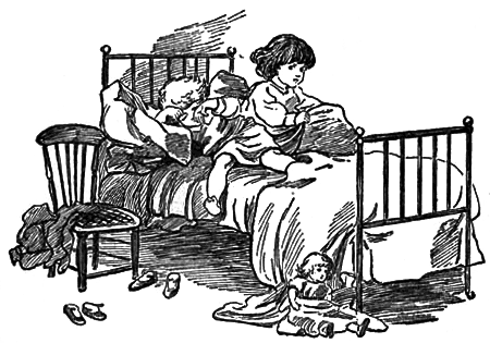 | Laura says she thinks she has almost heard them sometimes, talking to the birds; and they often sit very quiet indeed, with their dollies hugged tightly in their arms, and listen and watch. Once Eva went to sleep when she was watching like this, out in the grove back of her home, and she dreamed that a fairy came and danced for her and sang the sweetest songs you ever heard. |   |