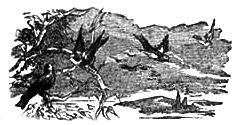 Then they came upon a big flock of turkeys, and the gobbler put on airs and pretended he was going to stop them; but they flew past and laughed at him.