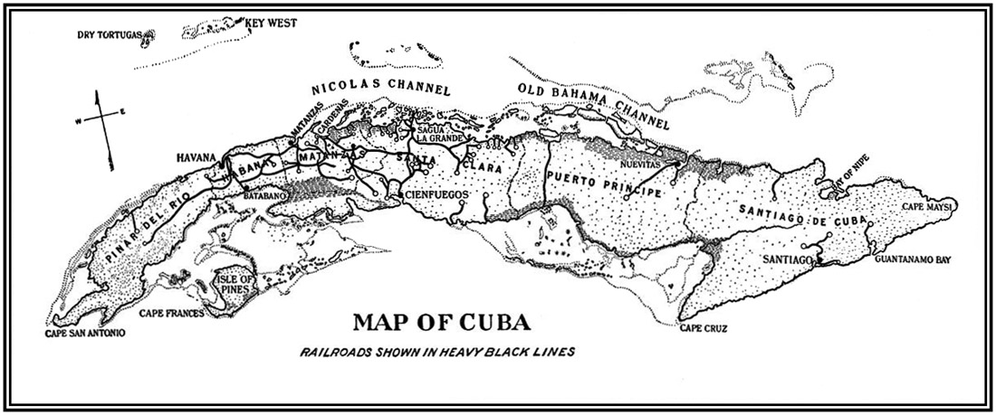 The advantage—nay, the necessity—of thus distributing our battleships, having only four enemies to fear, will appear from a glance at the map of Cuba. It will there be seen that [60]the island is particularly narrow abreast of Havana, and that from there, for a couple of hundred miles to the eastward, extends the only tolerably developed railroad system, by which the capital is kept in communication with the seaports, on the north coast as far as Sagua la Grande, and on the south with Cienfuegos and Batabano. This narrowness, and the comparative facility of communication indicated by the railroads, enabled Spain, during her occupation, effectually to prevent combined movements between the insurgents in the east and those in the west; a power which Weyler endeavored to increase by the trocha system,—a ditch or ditches, with closely supporting works, extending across the island. Individuals, or small parties, might slip by unperceived; but it should have been impossible for any serious co-operation to take place. The coast-wise railroads, again, kept Havana and the country adjacent to them in open, if limited, communication with the sea, so long as any one port upon their lines remained unblockaded. For reasons such as these, in this belt of land, from Havana to Sagua and Cienfuegos, lay the chief strength of the Spanish [61]tenure, which centred upon Havana; and in it the greatest part of the Spanish army was massed. Until, therefore, we were ready to invade, which should not have been before the close of the rainy season, the one obvious course open to us was to isolate the capital and the army from the sea, through which supplies of all kinds—daily bread, almost, of food and ammunition—were introduced; for Cuba, in these respects, produces little.
