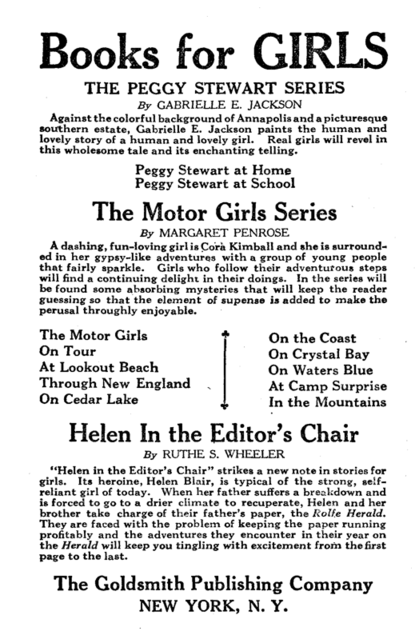 Jessie and Bertha Blair had never ridden so fast before. Mark Stratford knew his car well, 199 and coaxed it along over the well-oiled roads of Westchester at a speed to make anybody gasp.