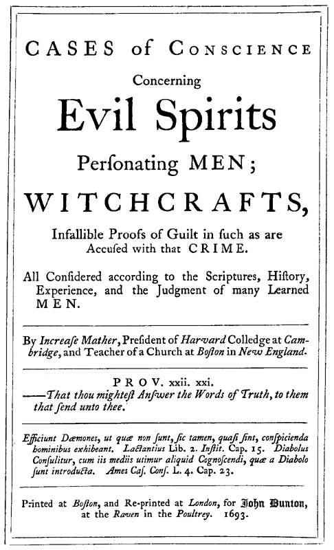 Whatever we may think of the credulity of these two ecclesiastics, there can be no ground for charging them with acting otherwise than conscientiously, and they had claims on the gratitude of their countrymen sufficient to overbalance their error of judgment on this occasion. Their books relating to the terrible witchcraft delusion at Salem have now become very rare in the original editions, and their interest, as remarkable monuments of the history of superstition, make them well worthy of a reprint.