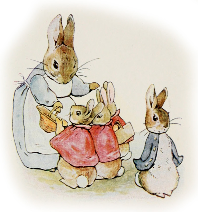 AUJOURD’HUI, mes chéris,” dit mère Lapin, “je vous permets d’aller dans les champs ou de descendre le sentier; mais n’entrez pas dans le jardin de Mr. Mac Grégor. Un accident affreux arriva à votre pauvre père dans ce maudit jardin. Il fut attrapé et mis en pâté par Madame Mac Grégor.”