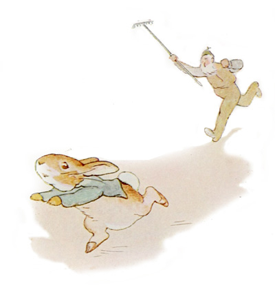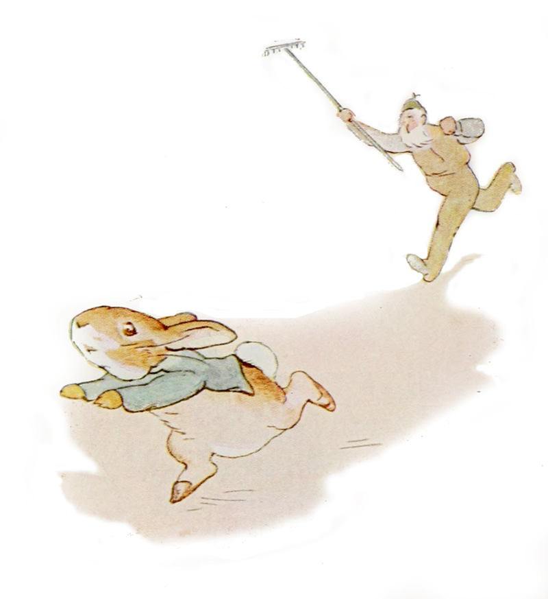 MR. MAC GRÉGOR est à quatre pattes, en train de planter des choux. Il se lève d’un bond, saisit un râteau, et s’élance à la poursuite de Pierre, en criant à tue-tête: “Au voleur! au voleur!”