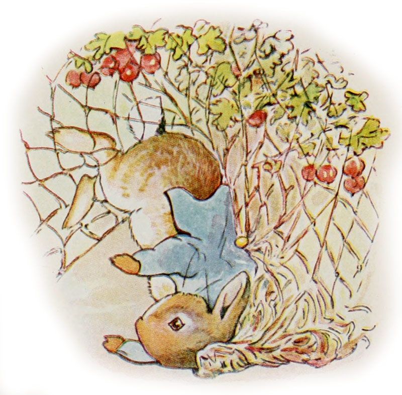 UN lapin court mieux pieds nus, et certainement beaucoup plus vite. Par malheur, Pierre rencontre un groseiller recouvert d’un filet. Il y reste suspendu par les larges boutons de sa jaquette. Quelle imprudence de porter un habit à larges boutons parmi les groseillers! C’était une jaquette bleue, toute neuve, avec des boutons dorés.