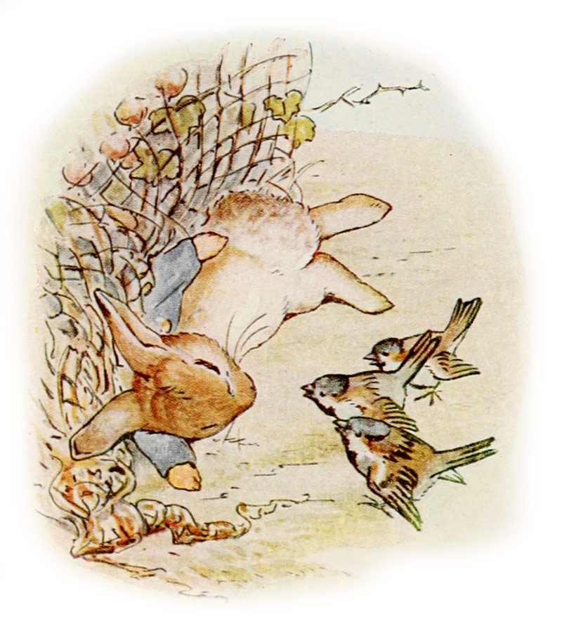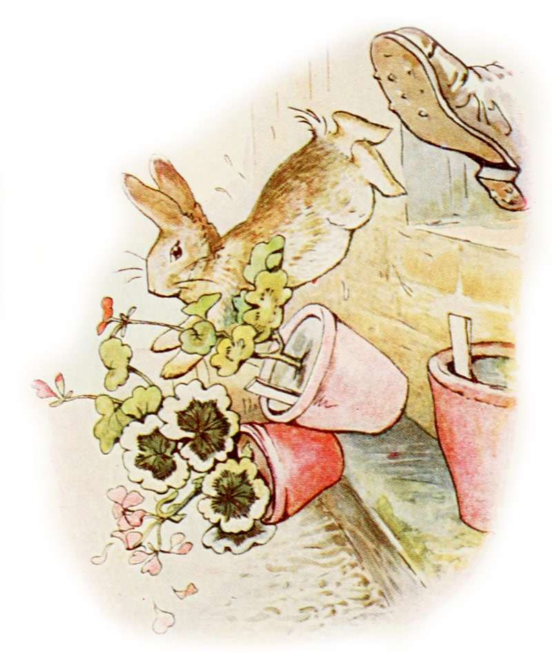 [53]UN petit corps brun et mouillé passe sous le nez de Mr. Mac Grégor, franchit la fenêtre et renverse trois pots de fleurs.
