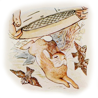 MR. MAC GRÉGOR arrivait avec un tamis, il voulait le lancer sur le dos du lapin. Pierre se tortilla si bien qu’il put se sauver à temps, en laissant sa jaquette accrochée au filet.