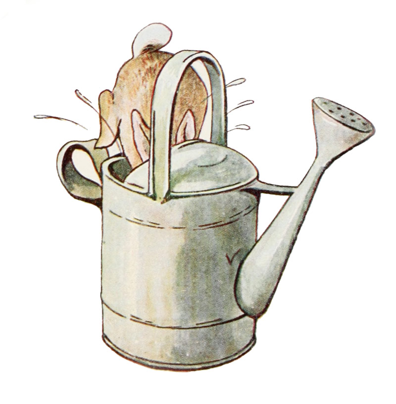 [47]IL bondit vers une cabane dans laquelle Mr. Mac Grégor rangeait les objets nécessaires au jardinage. Pierre aperçoit un arrosoir, il s’y précipite. C’eût été une très bonne cachette; malheureusement, il y avait de l’eau dedans!