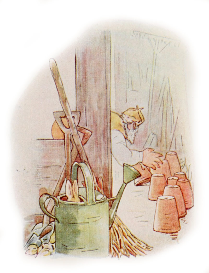 MR. MAC GRÉGOR avait bien vu Pierre entrer dans la cabane aux outils. “Il se sera caché sous un pot de fleurs!” se dit-il. Il soulève chaque pot avec précaution, espérant saisir le lapin. At choum! at choum! fait Pierre dans son arrosoir, car l’eau est assez froide. “Tiens, tiens,” dit Mr. Mac Grégor, “un arrosoir qui éternue!” Et il s’élance de ce côté.