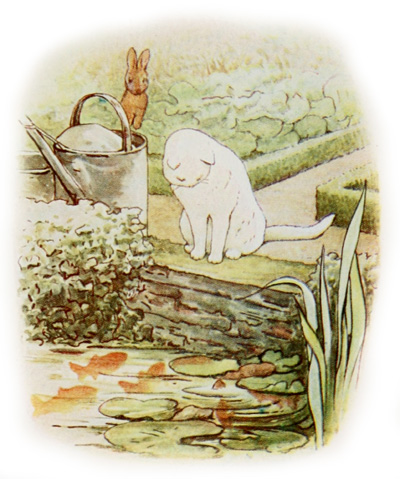 Une chatte blanche se tient au bord, immobile, guettant les poissons rouges. Seul, le bout de sa queue va et vient comme un balancier. La chatte n’a point vu Pierre: “Ce qu’il y a de mieux à faire,” pense-t-il, c’est de s’éloigner sans rien dire: “Mon cousin Jeannot m’a fort mal parlé des chats!”[65]