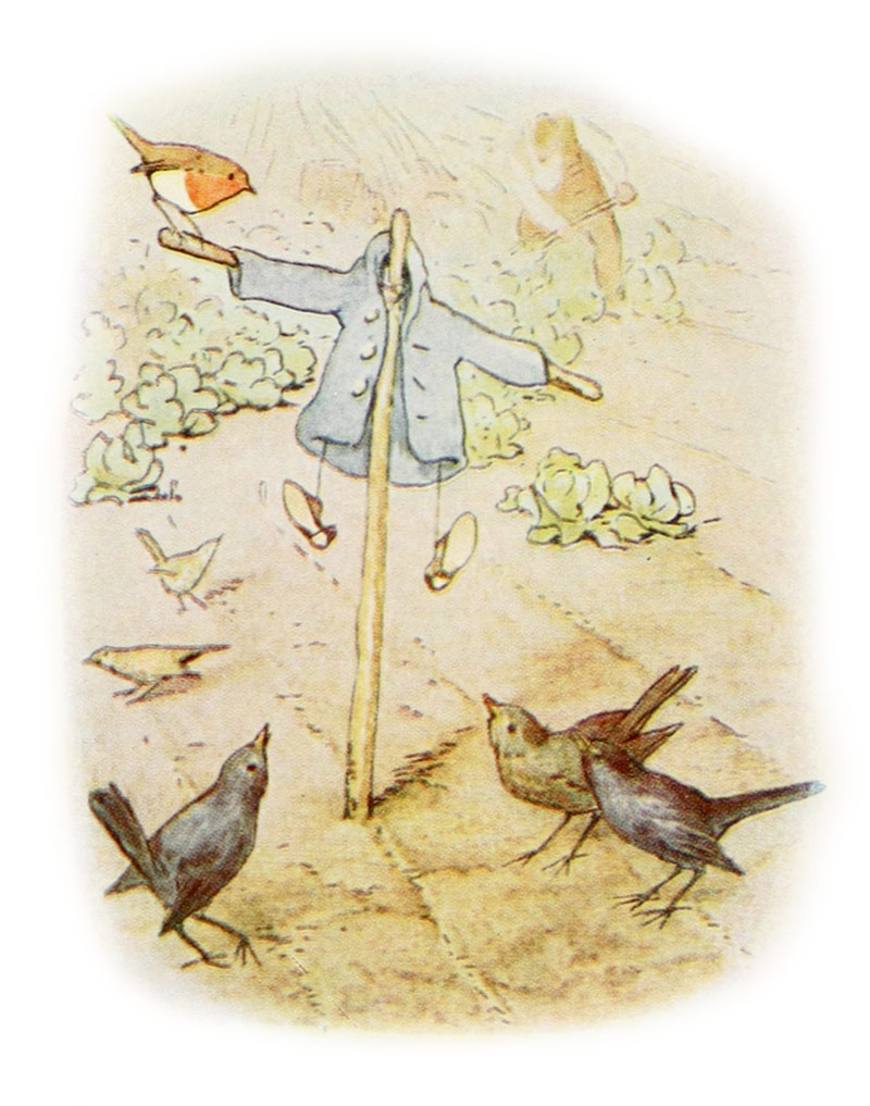 MR. MAC GRÉGOR ramasse la petite jaquette et les sabots pour en faire un épouvantail. Mais les oiseaux les reconnaissent et n’en ont point peur.