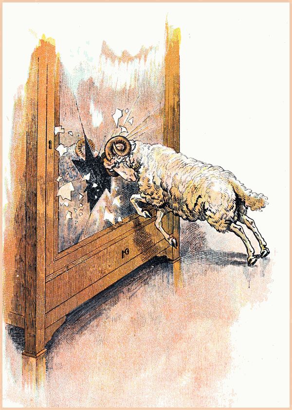 Puis il descendit l'escalier et quitta la maison, très fier d'avoir mis l'autre bélier en fuite.