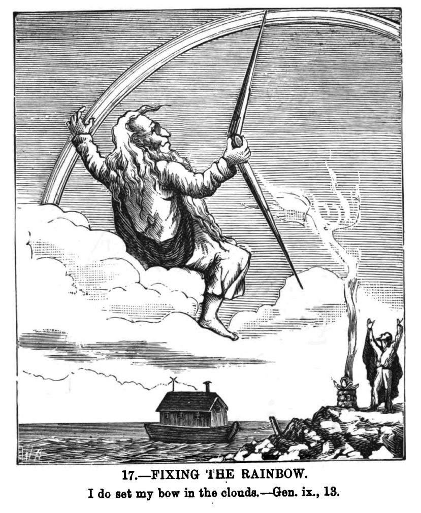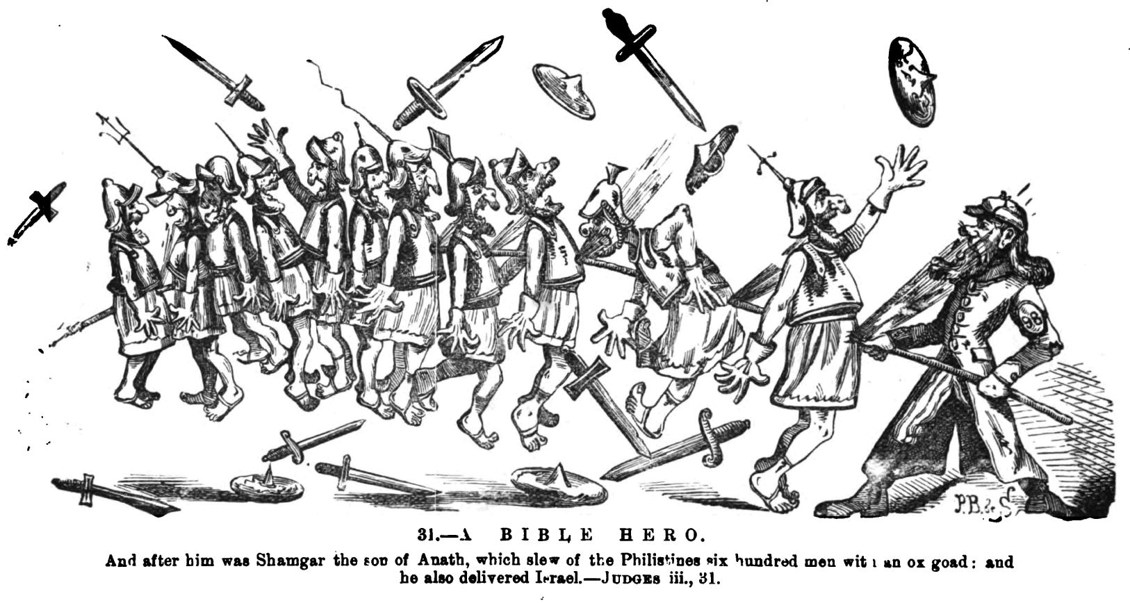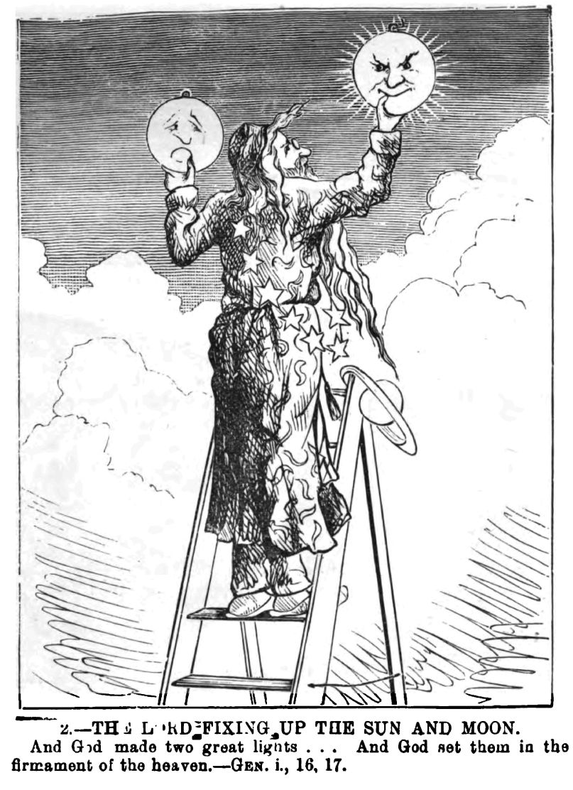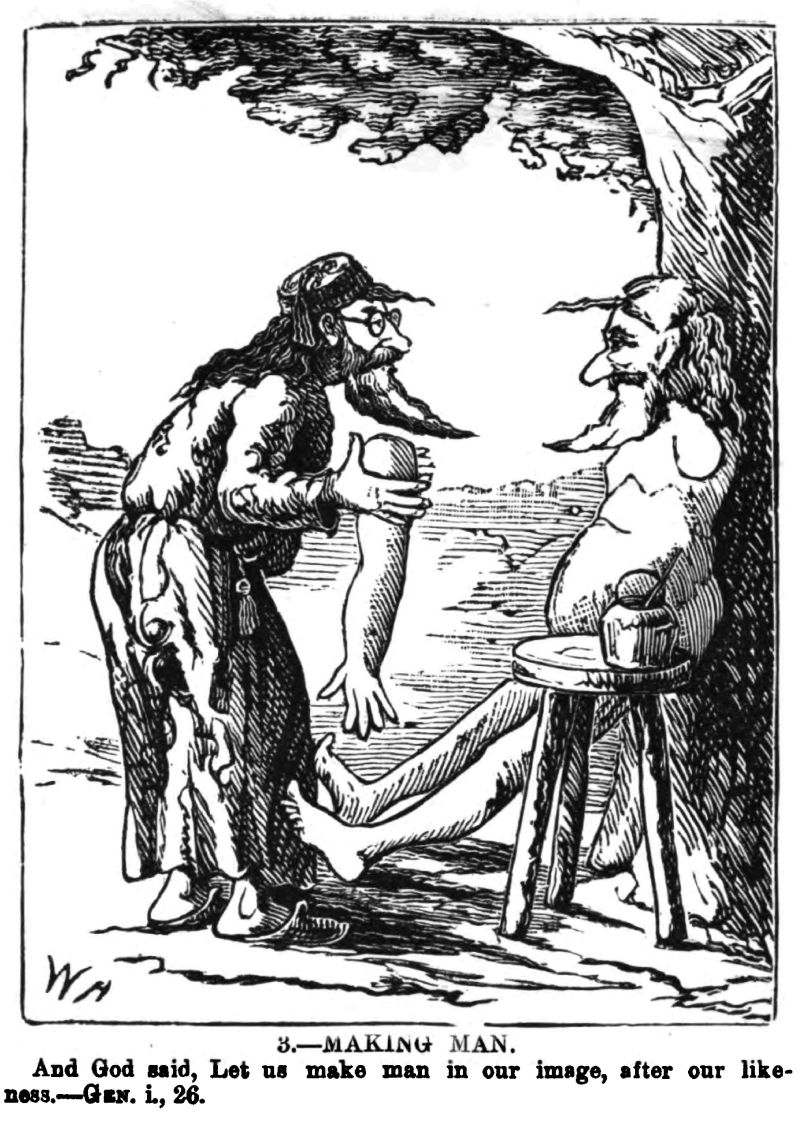 The same spirit has animated us in designing the pictures. Our object has been to take the Bible text always as our basis, to include no feature which is contradicted by it, and to introduce as many comicalities and anachronisms as possible consistently with this rule. We are therefore able to defy criticism. Bibliolators may vituperate us, persecute us, or imprison us, but they cannot refute us.. We can safely challenge them to prove that a single incident happened otherwise than we have depicted it. We can candidly say to them—"The thing must have happened in some way, as to which the Divine Word is silent; this is our view,—What is yours?" And we humbly submit that our speculations are as valid as our neighbors'. Nothing but the insanest bigotry in favor of their own conjectures could lead them to quarrel with us for expounding ours. If they can shame us with explicit disproofs from Holy Writ, let them do so; but what right have they to set up their carnal imaginings and uninspired theories as the ultimate criteria of truth?