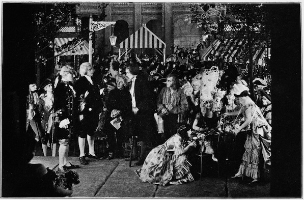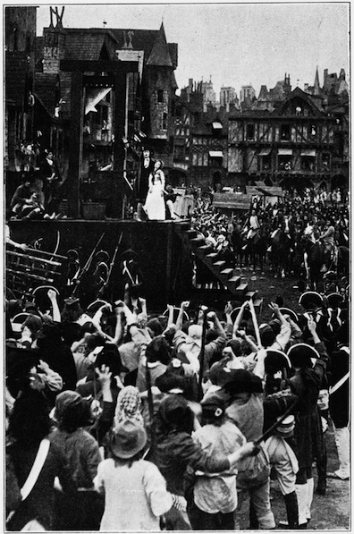 “For the honor of France,” he cries to the assembled multitude, as he still upholds her swaying figure, “a monstrous 188 injustice is righted. This girl, and that young patriot,” signifying to the attendants that de Vaudrey should be unloosed, “are reprieved by the order of the Revolutionary Tribunal!” The multitude––caught by Danton’s tensely dramatic announcement––applauds, even as it had jeered and mocked a few moments since.
