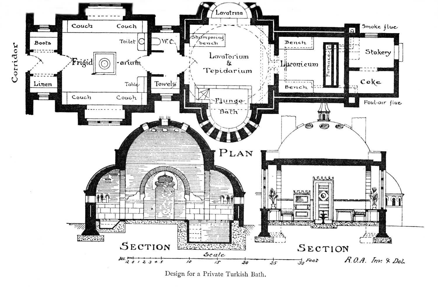 [4] Here is a branch of architectural design absolutely unstudied. Few architects visit the East, and none enter the baths there, either in Egypt, Turkey, or Morocco. The ordeal of the true Oriental shampooing doubtless deters the few who might be curious about these buildings.