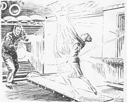 Lanier and Randall slowly followed, and despite himself a slight shudder shook the latter's body as he stepped into the mechanism that in moments would send him flashing out through the great void as impalpable ether-vibrations. Milton and Lanier were standing silent beside him, their eyes on Nelson, who stood watchfully now at the big switchboard beside the chambers, his own gaze on the clock. They saw him touch a stud, and another, and the hum of the great dynamos at the room's end grew loud as the swarming of angry bees.