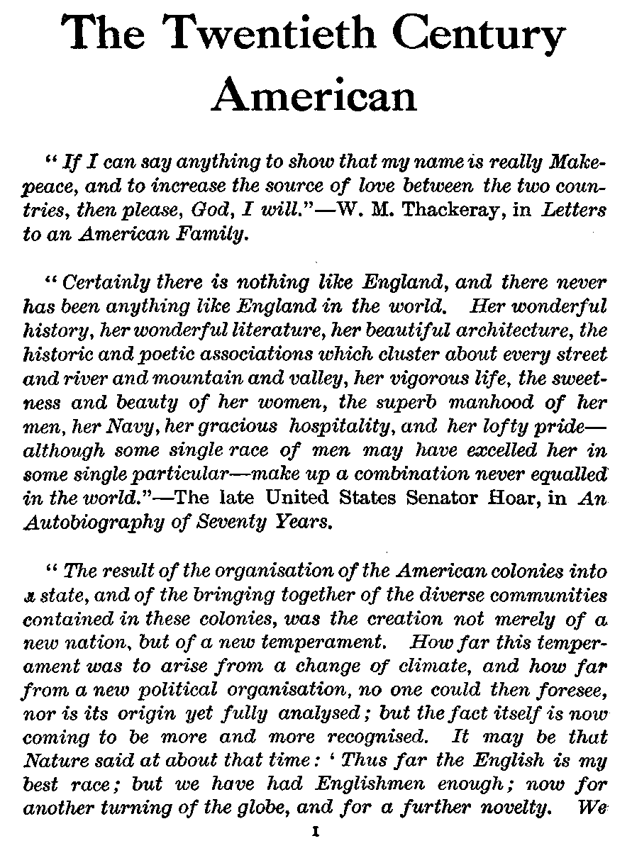 "The result of the organisation of the American colonies into a state, and of the bringing together of the diverse communities contained in these colonies, was the creation not merely of a new nation, but of a new temperament. How far this temperament was to arise from a change of climate, and how far from a new political organisation, no one could then foresee, nor is its origin yet fully analysed; but the fact itself is now coming to be more and more recognised. It may be that Nature said at about that time: 'Thus far the English is my best race; but we have had Englishmen enough; now for another turning of the globe, and for a further novelty. We [2]need something with a little more buoyancy than the Englishman; let us lighten the structure, even at some peril in the process. Put in one drop more of nervous fluid and make the American.' With that drop, a new range of promise opened on the human race, and a lighter, finer, more highly organised type of mankind was born."—Thomas Wentworth Higginson, Atlantic Monthly, 1886.