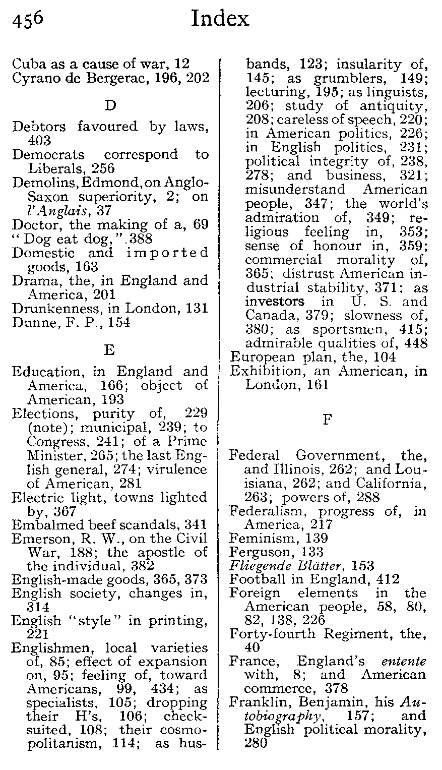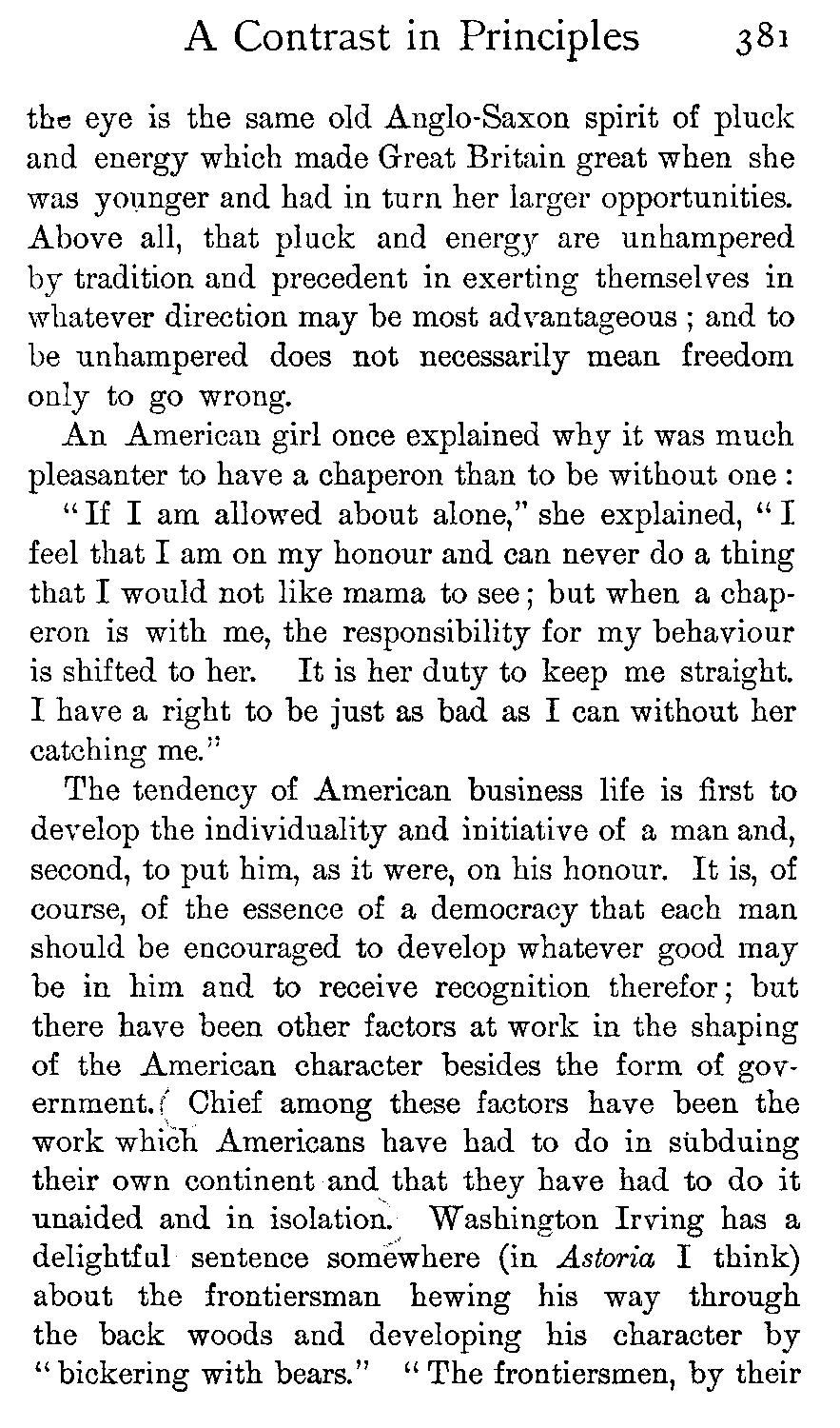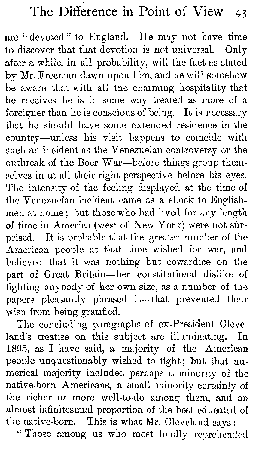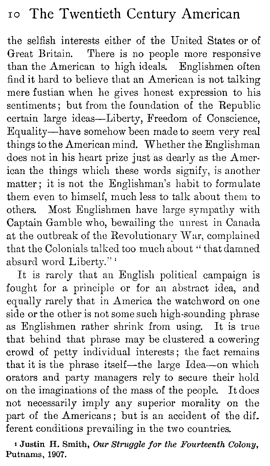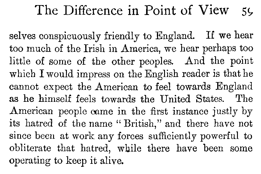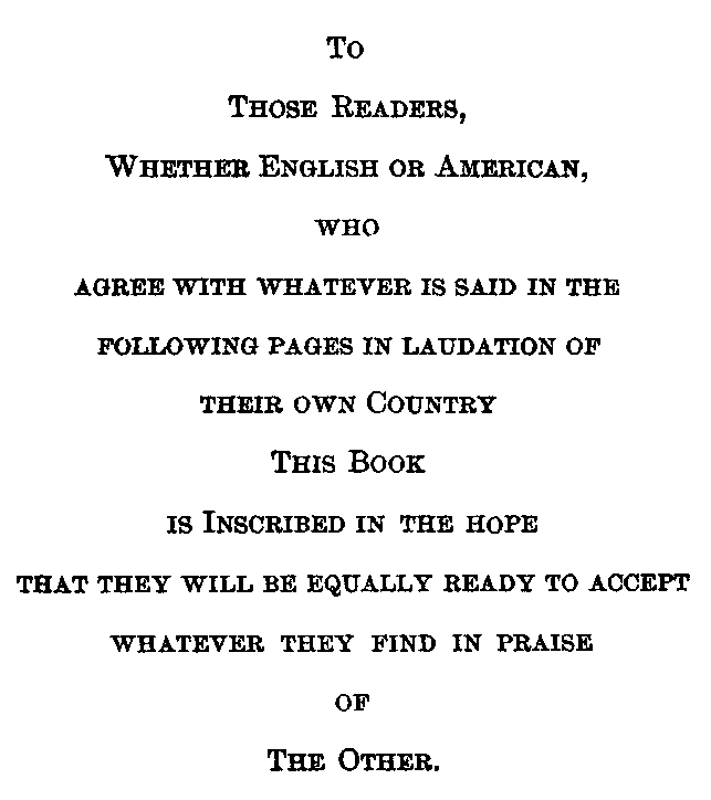 In the case of two peoples so much alike as the English and the American, between whom friendship and alliance would be so entirely in accord with eternal fitness, who are yet held apart by misunderstanding on the part of each of the other's character, there seems no better way than to face the misunderstandings frankly and to endeavour to make each see how unjustly it undervalues the other's good qualities or overestimates its faults. At present neither Americans nor Englishmen understand what good fellows the others are. [430]Least of all do they understand how essentially they are the same kind of good fellows.