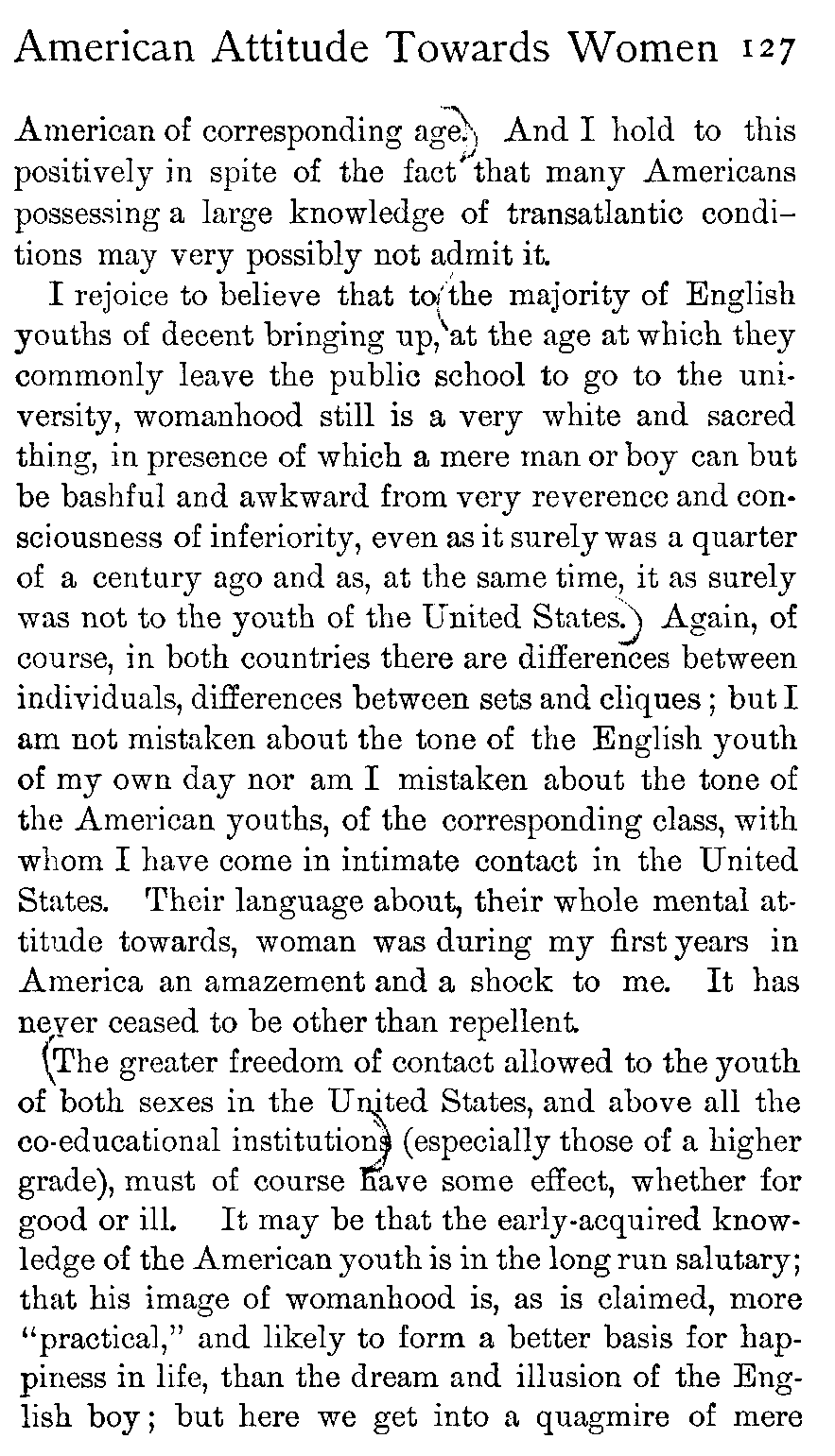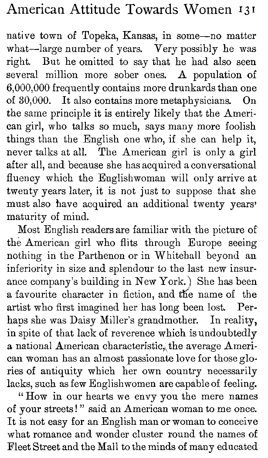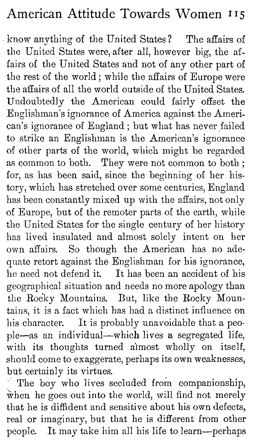 The Isolation of the United States—American Ignorance of the World—Sensitiveness to Criticism—Exaggeration of their Own Virtues—The Myth of American Chivalrousness—Whence it Originated—The Climatic Myth—International Marriages—English Manners and American—The View of Womanhood in Youth—Co-education of the Sexes—Conjugal Morality—The Artistic Sense in American Women—Two Stenographers—An Incident of Camp-Life—"Molly-be-damned"—A Nice Way of Travelling—How do they do it?—Women in Public Life—The Conditions which Co-operate—The Anglo-Saxon Spirit again. |