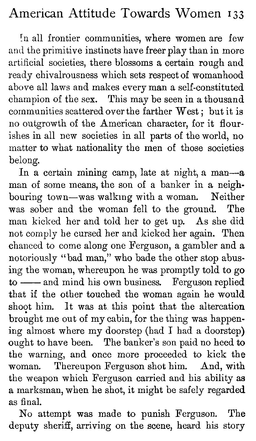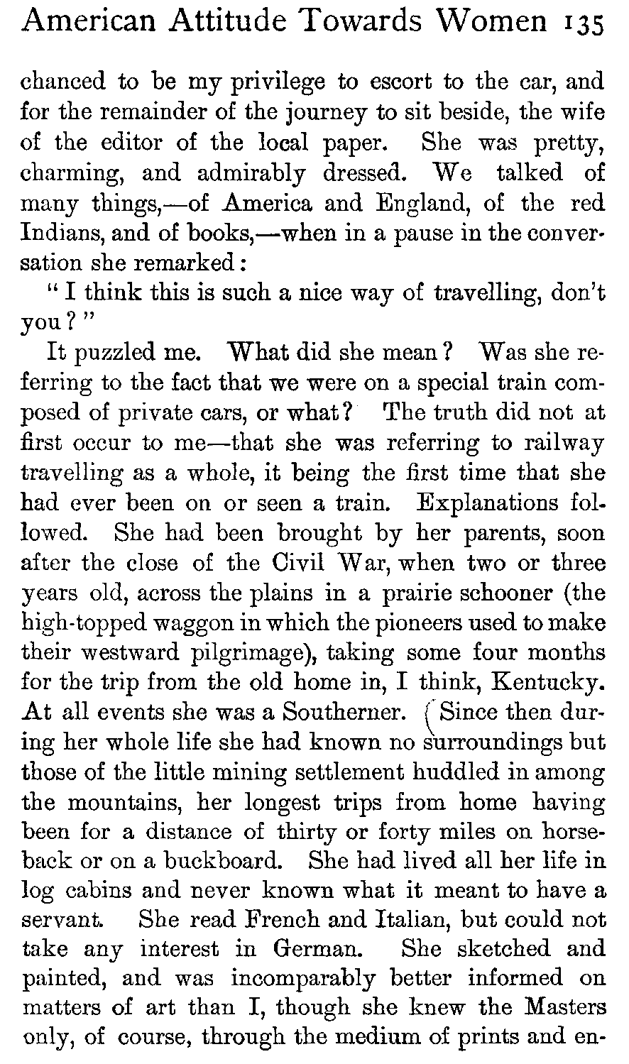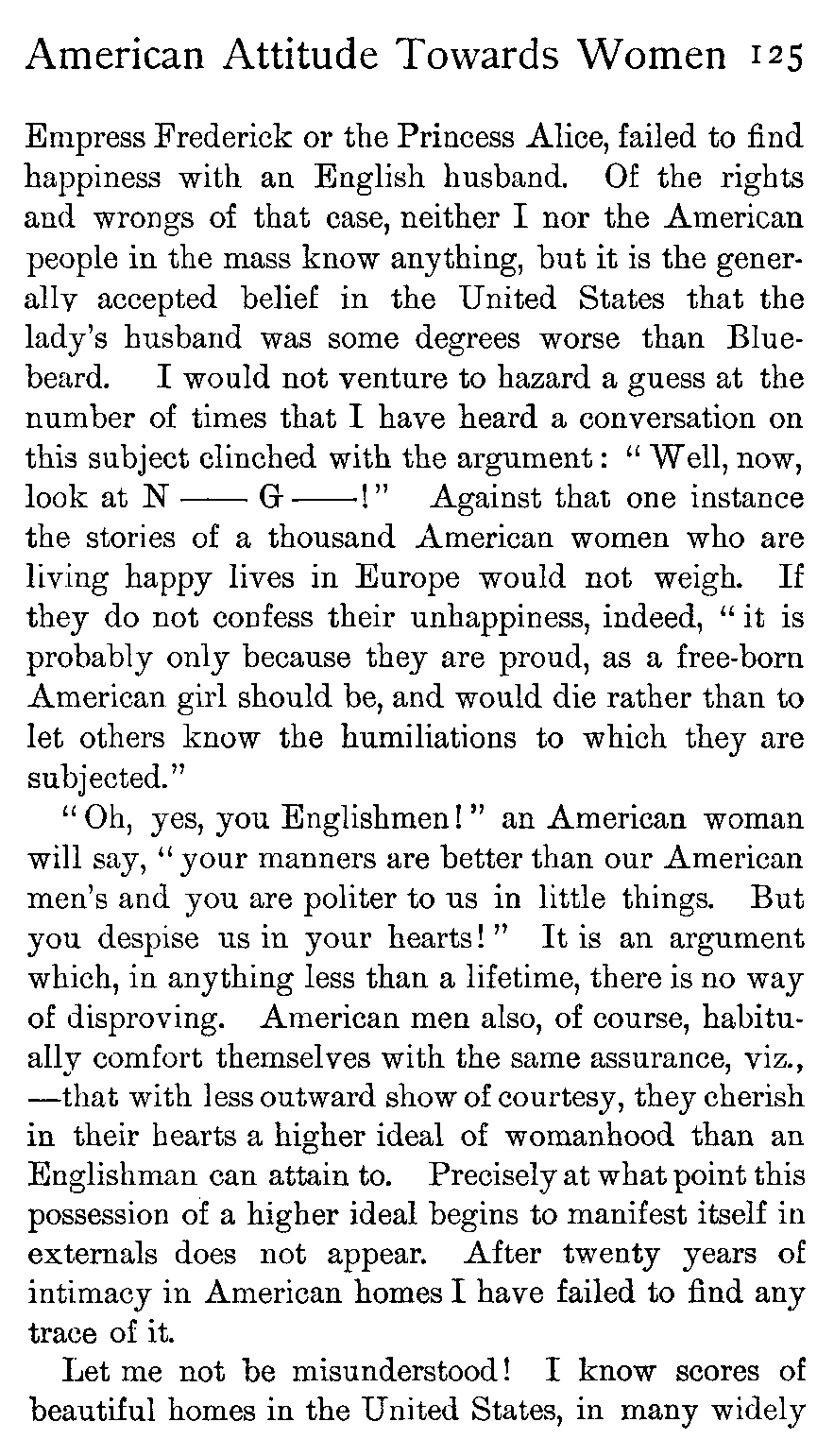The Isolation of the United States—American Ignorance of the World—Sensitiveness to Criticism—Exaggeration of their Own Virtues—The Myth of American Chivalrousness—Whence it Originated—The Climatic Myth—International Marriages—English Manners and American—The View of Womanhood in Youth—Co-education of the Sexes—Conjugal Morality—The Artistic Sense in American Women—Two Stenographers—An Incident of Camp-Life—"Molly-be-damned"—A Nice Way of Travelling—How do they do it?—Women in Public Life—The Conditions which Co-operate—The Anglo-Saxon Spirit again. |