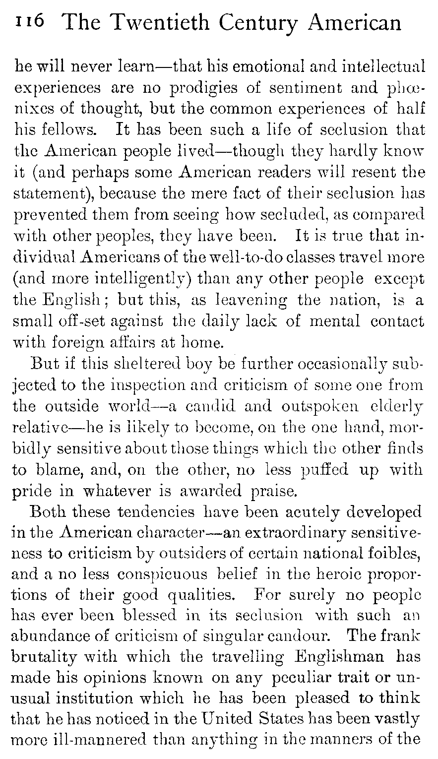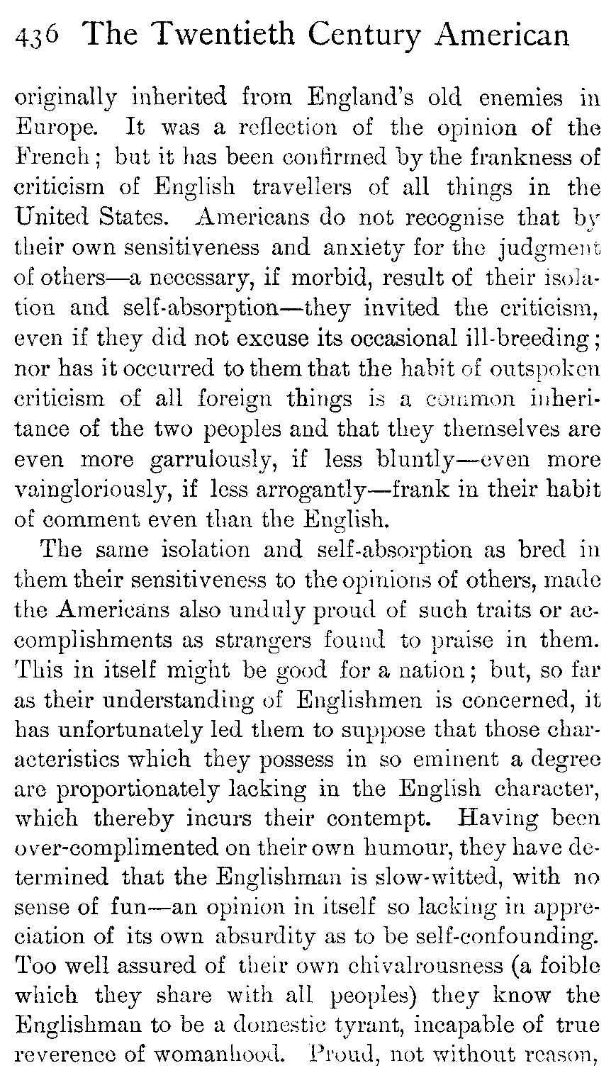 And as the American people has formed no comprehension of the British Empire as a whole and is without any understanding of its spirit, so it has drawn for itself a caricature of the British character. As the Empire is brutal and sanguinary, so is the individual bullying and overbearing and coarse. The idea was [436]originally inherited from England's old enemies in Europe. It was a reflection of the opinion of the French; but it has been confirmed by the frankness of criticism of English travellers of all things in the United States. Americans do not recognise that by their own sensitiveness and anxiety for the judgment of others—a necessary, if morbid, result of their isolation and self-absorption—they invited the criticism, even if they did not excuse its occasional ill-breeding; nor has it occurred to them that the habit of outspoken criticism of all foreign things is a common inheritance of the two peoples and that they themselves are even more garrulously, if less bluntly—even more vaingloriously, if less arrogantly—frank in their habit of comment even than the English.