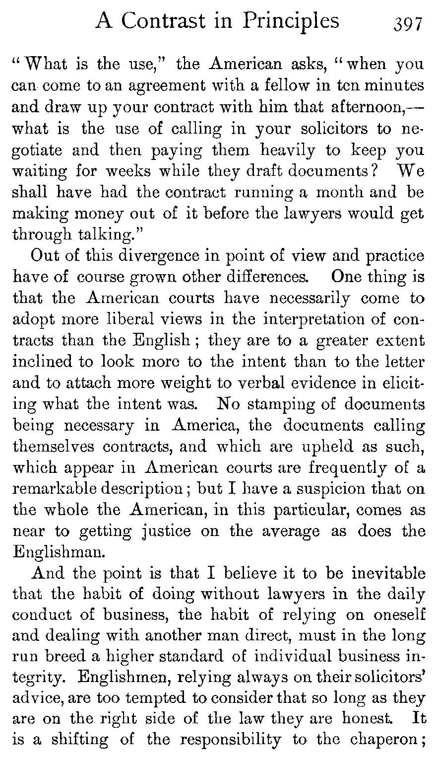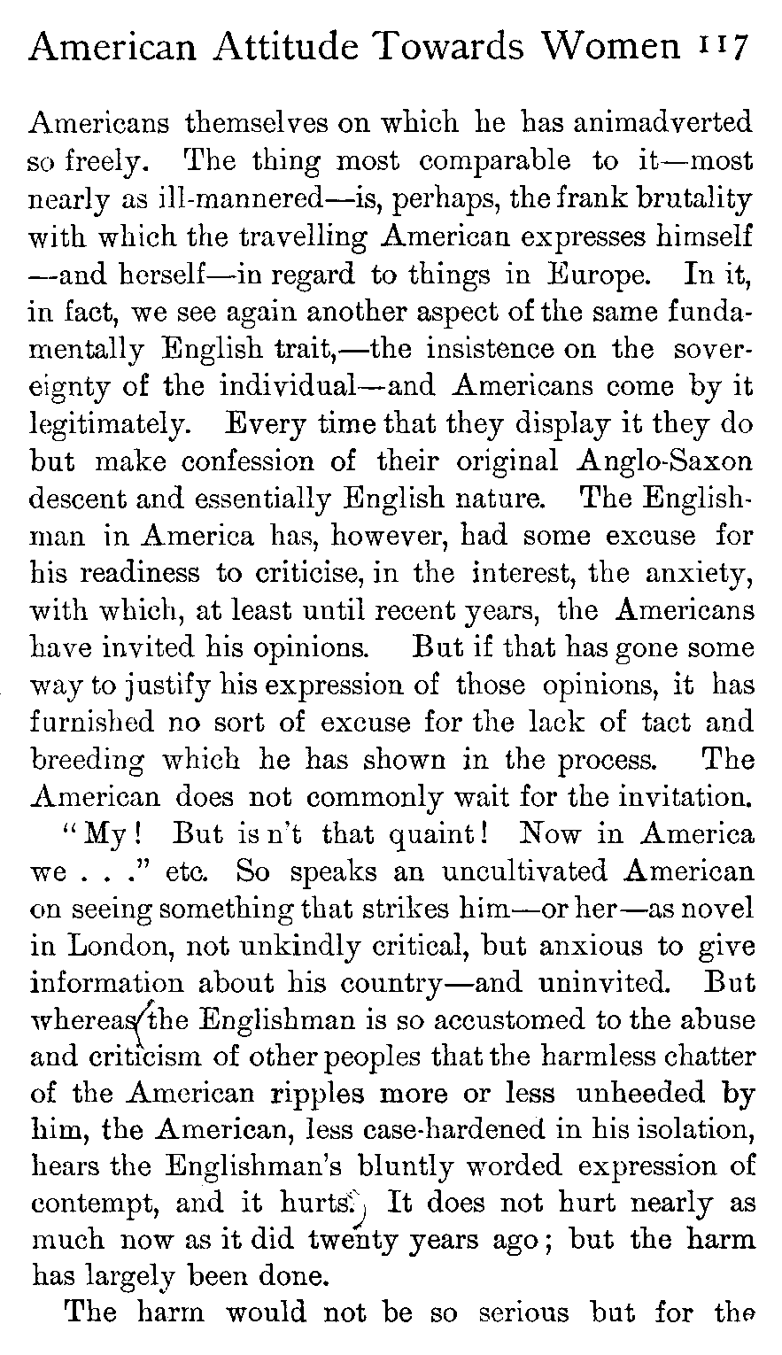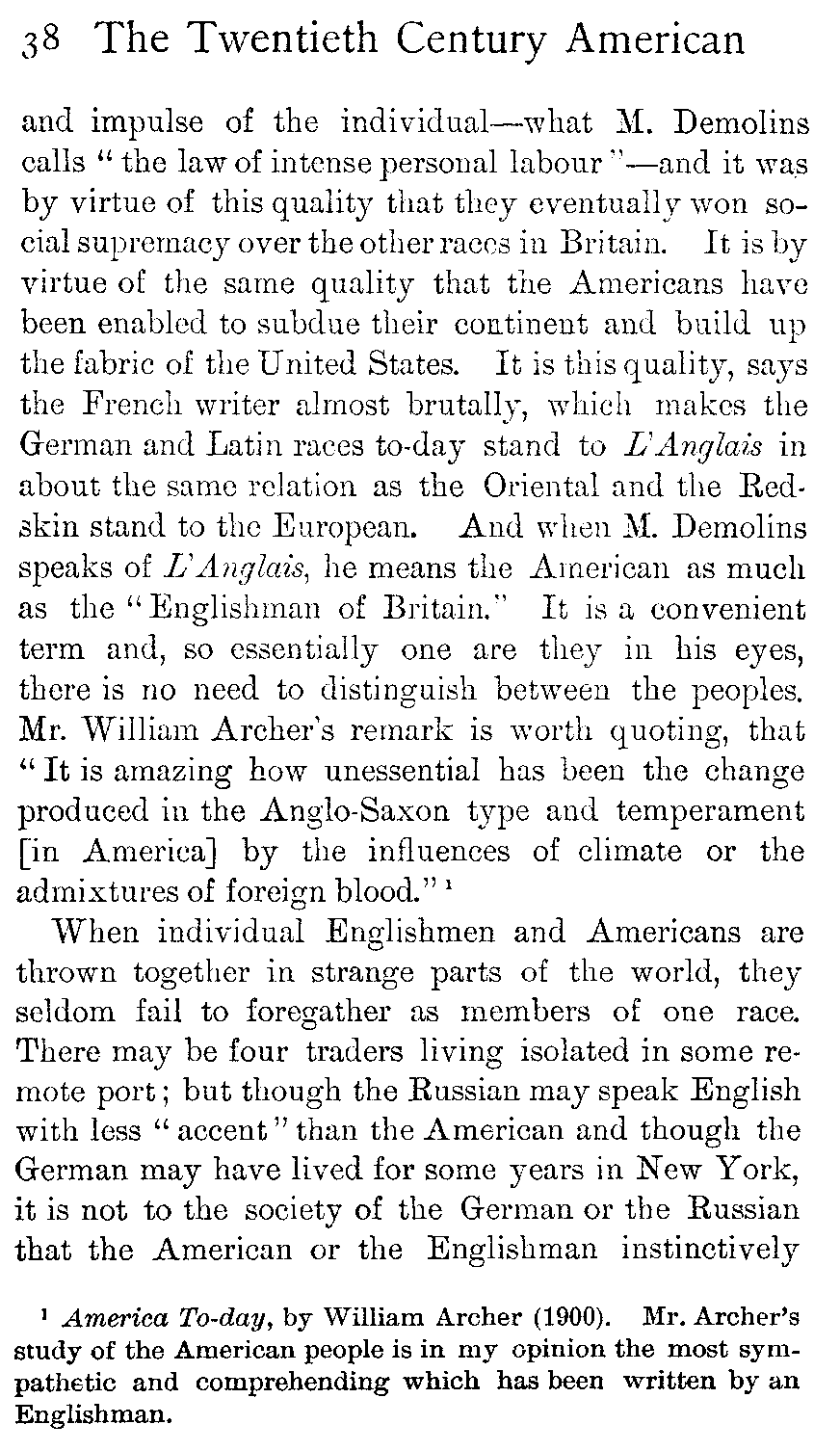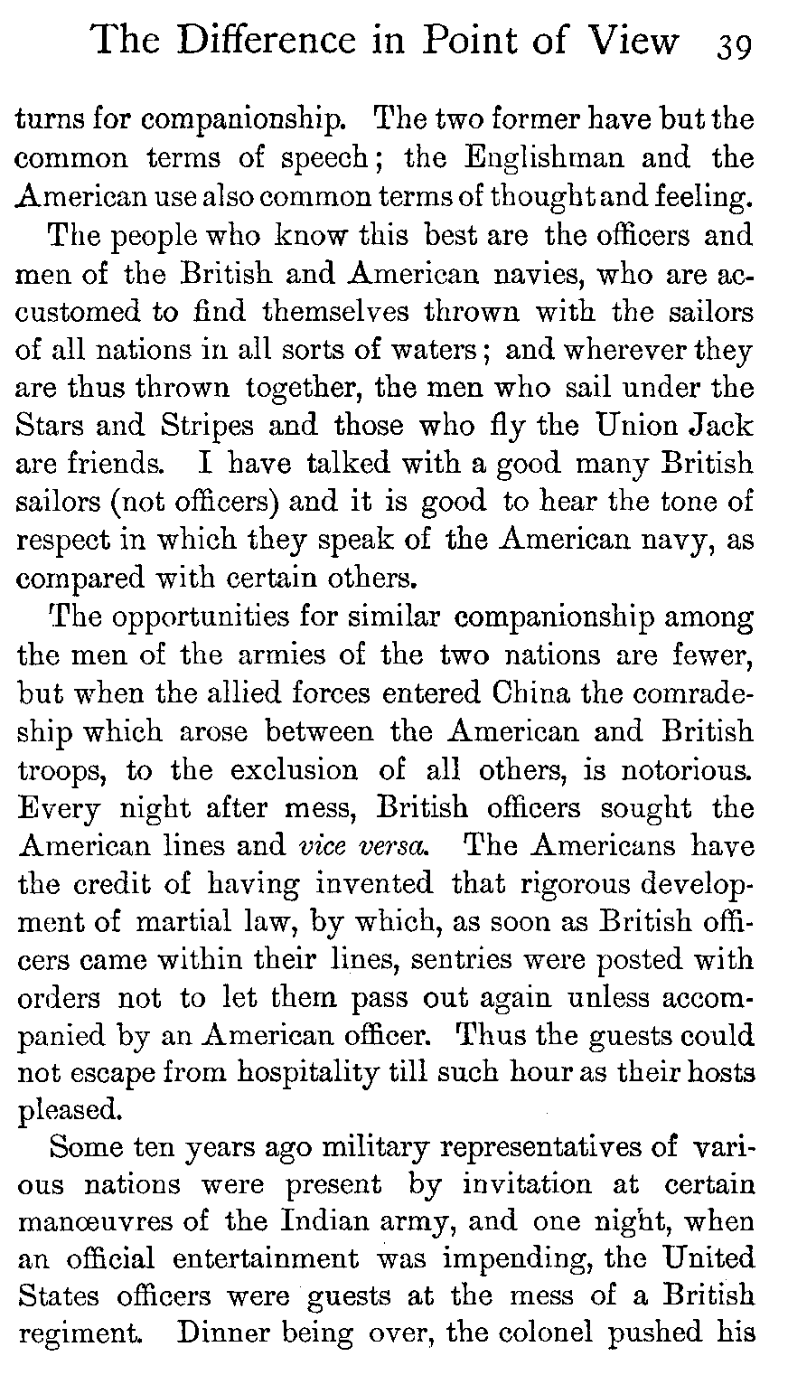 It is in the presence of such a remark, seriously made by so excellently capable a foreigner, that the Englishman and American ought to be able to shake hands and realise how much of a kin they are and how far removed from some other peoples.