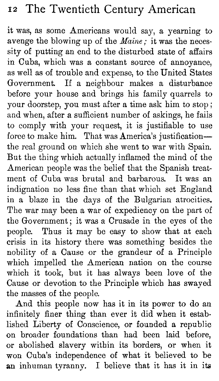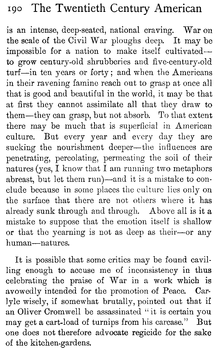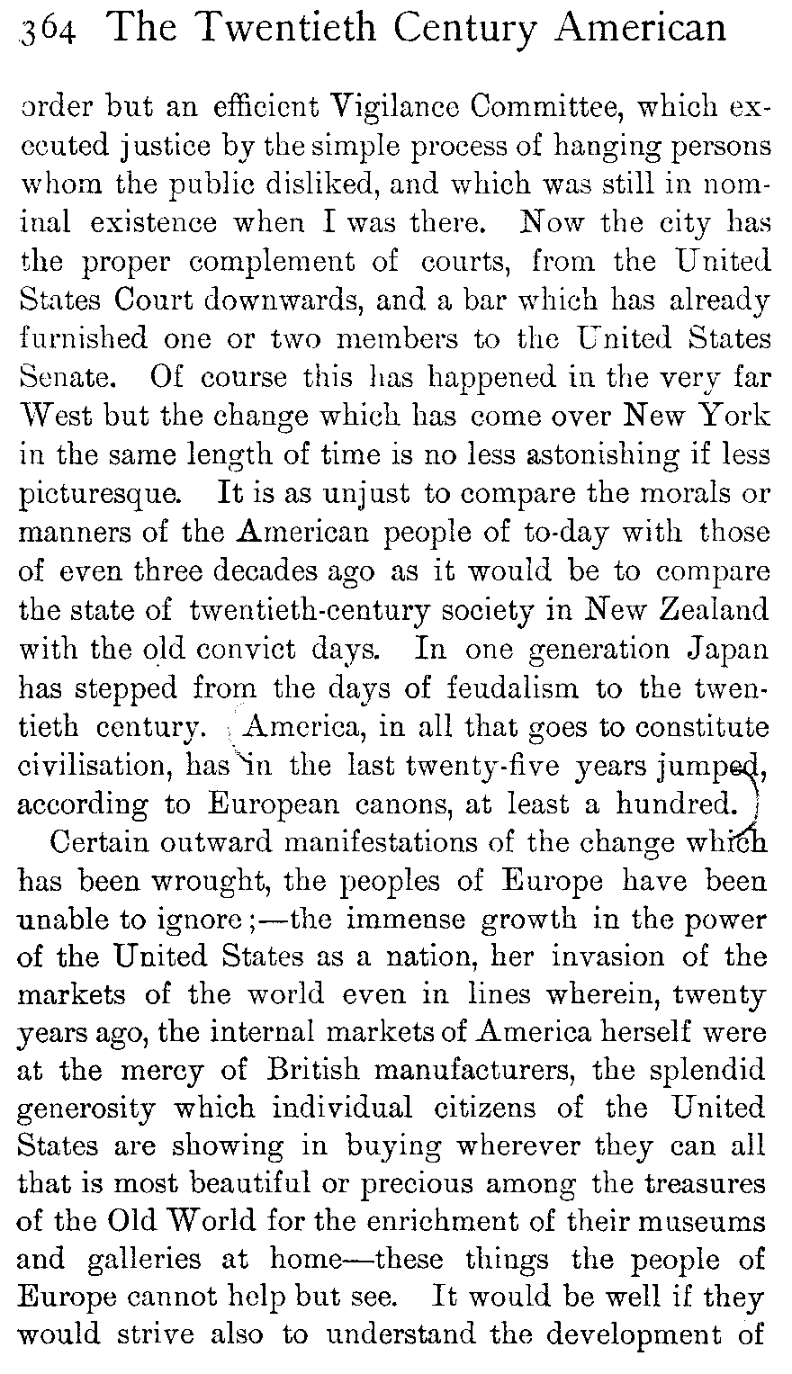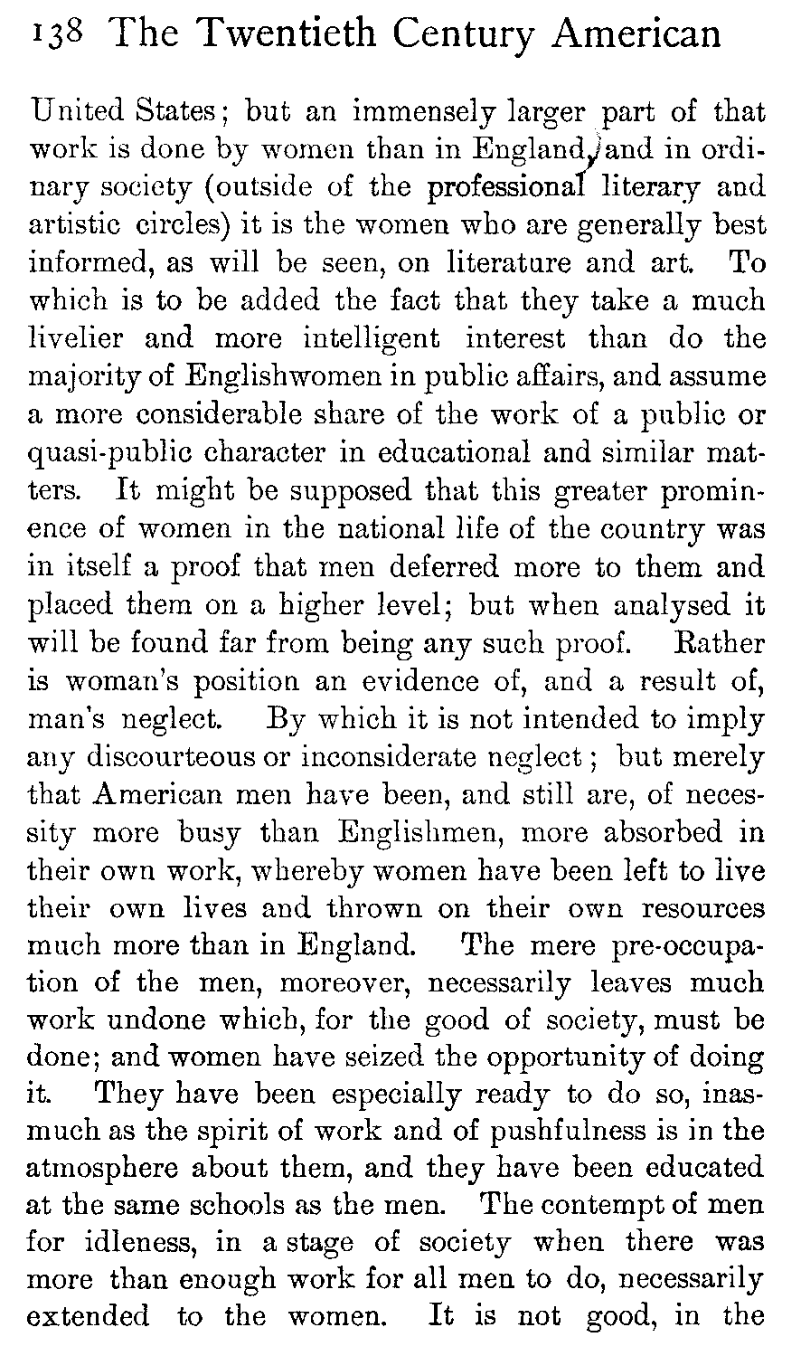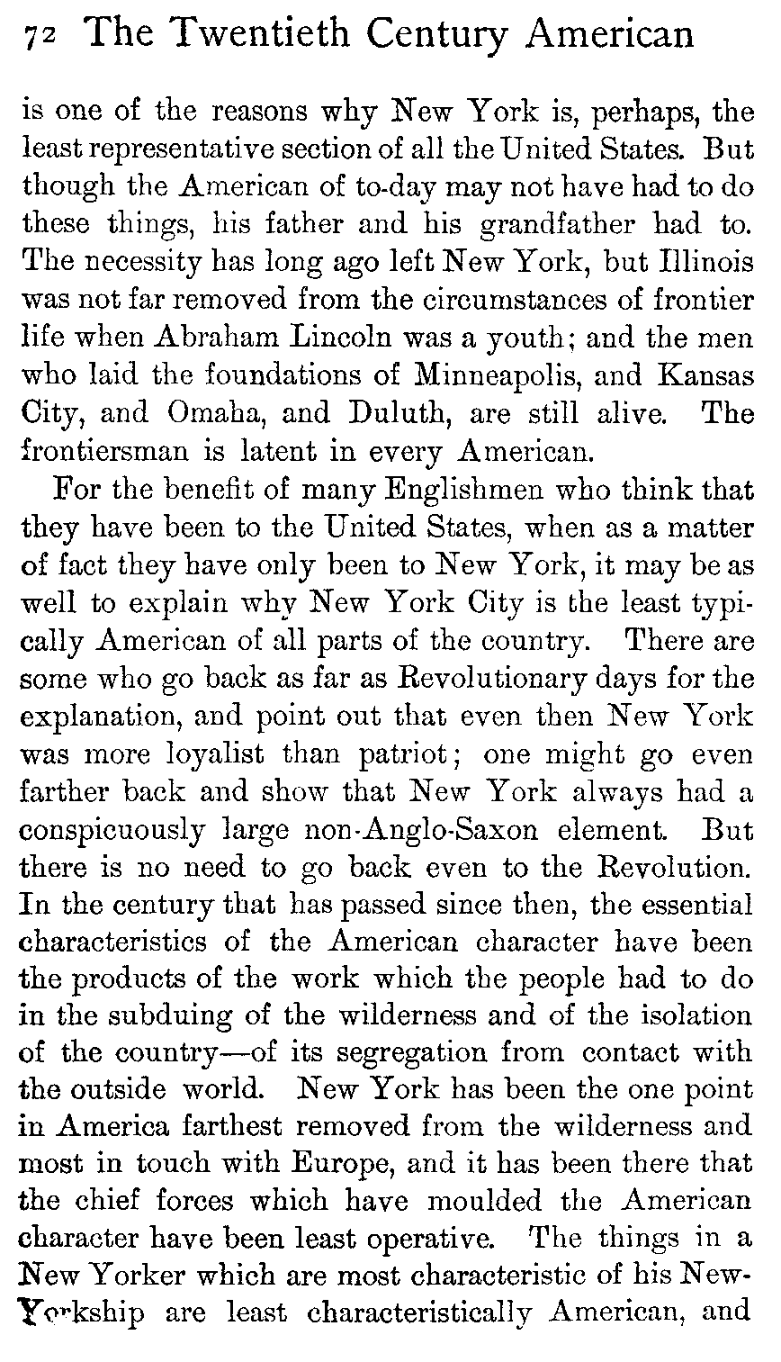 It may be that, living in the silences and solitudes of the frontier and the wilderness, they have found the greater need of ready speech when communication has offered. It may be that the mere necessity of planning together the framework of their society and of building up their State out of chaos has imposed on them the necessity of more outspokenness. Certainly they have discarded, or have not assumed, the reticence of the modern English of England; and much [449]of this freedom of utterance Europeans misinterpret, much (because the fashion of it is strange to themselves) they believe to be insincere. In which judgments they are quite wrong. The American people are profoundly sincere and intensely in earnest.