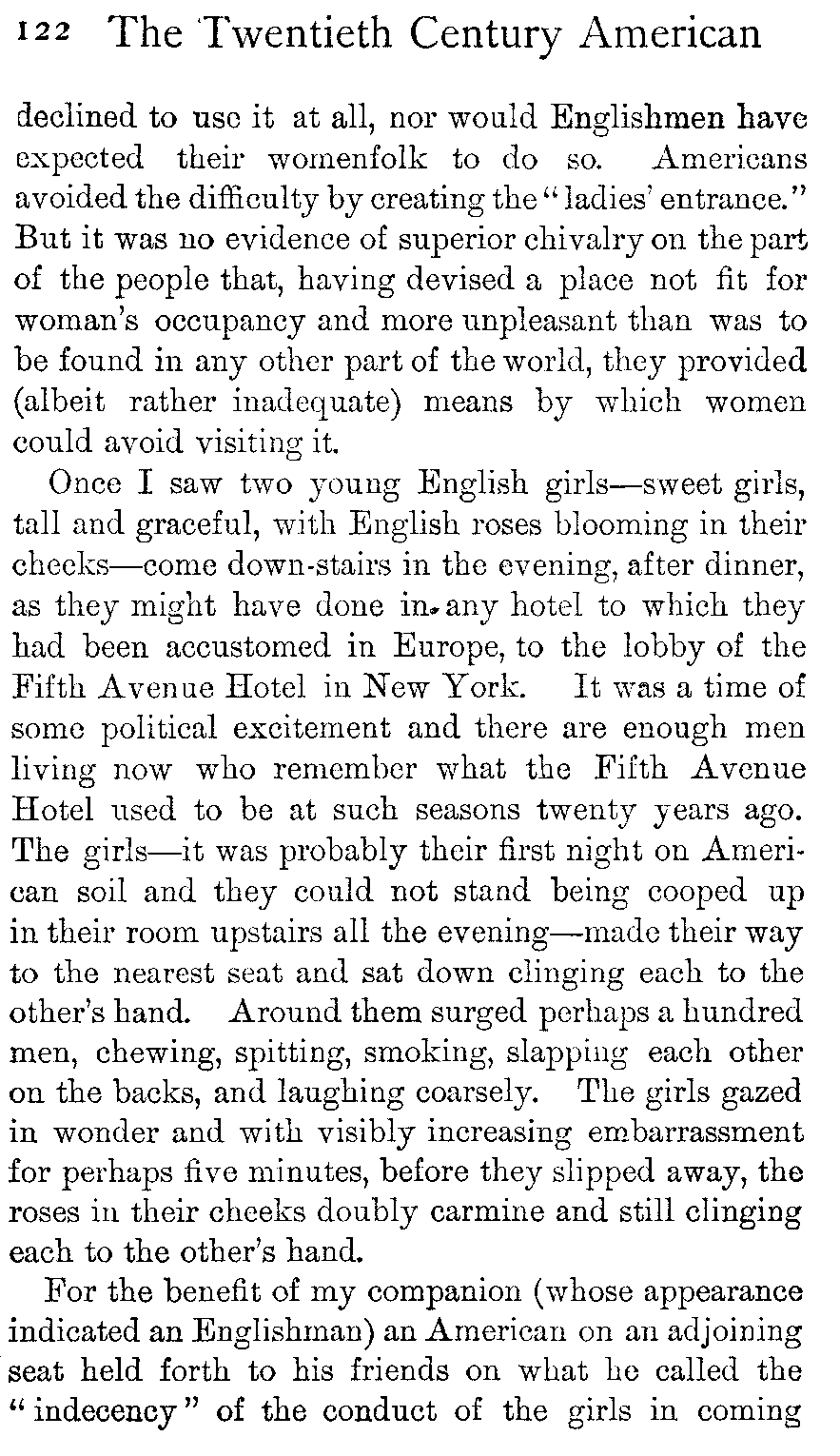During all these years individual Americans have come to England in large numbers and have been duly noted and observed; but what the people of any nation notices in the casually arriving representatives of any other is not the points wherein the visitors resemble themselves, but the points of difference. In the case of Americans coming to England the fundamental traits are all resemblances and therefore escape notice, while only the differences—which by that very fact stand proclaimed as non-essentials—attract attention. So it is that the English people, having had acquaintance with a number of typical New Englanders, have drawn their conclusion as to the universality of one strong nasal American accent; they think the American people garrulously outspoken in criticism, with a rather offensive boastfulness, without any consciousness that precisely that same trait in themselves, in a slightly different form, is one of the chief causes why Englishmen are not conspicuously popular in any European country. From peculiarities of dress and manner which are not familiar to him in the product of his own public schools and universities, the Englishman has been inclined to think that the American people is not, even in its "better classes," a population of gentlemen.