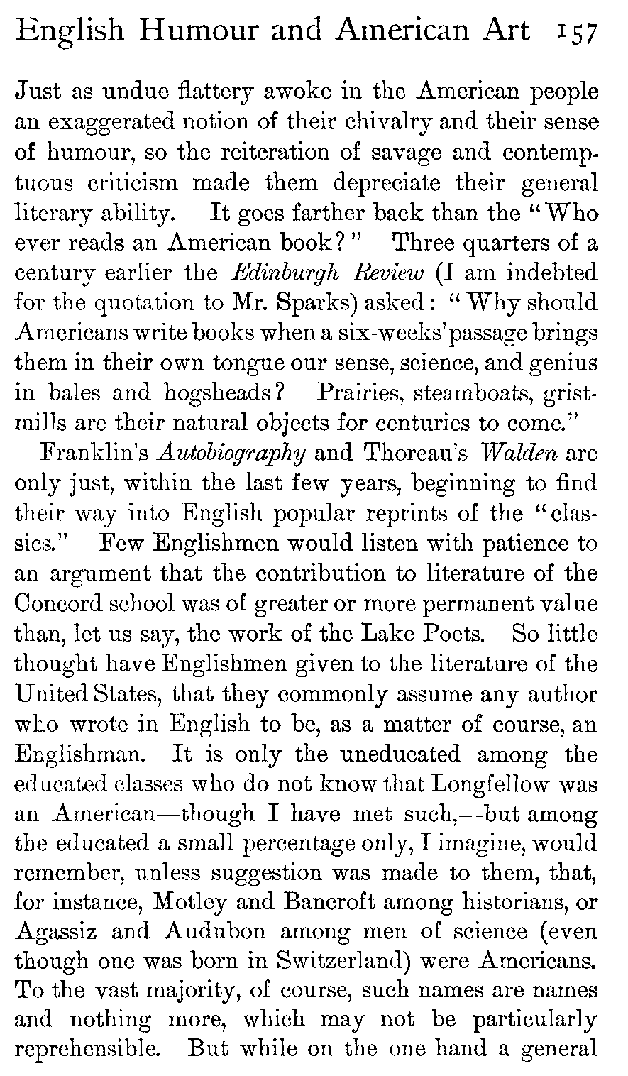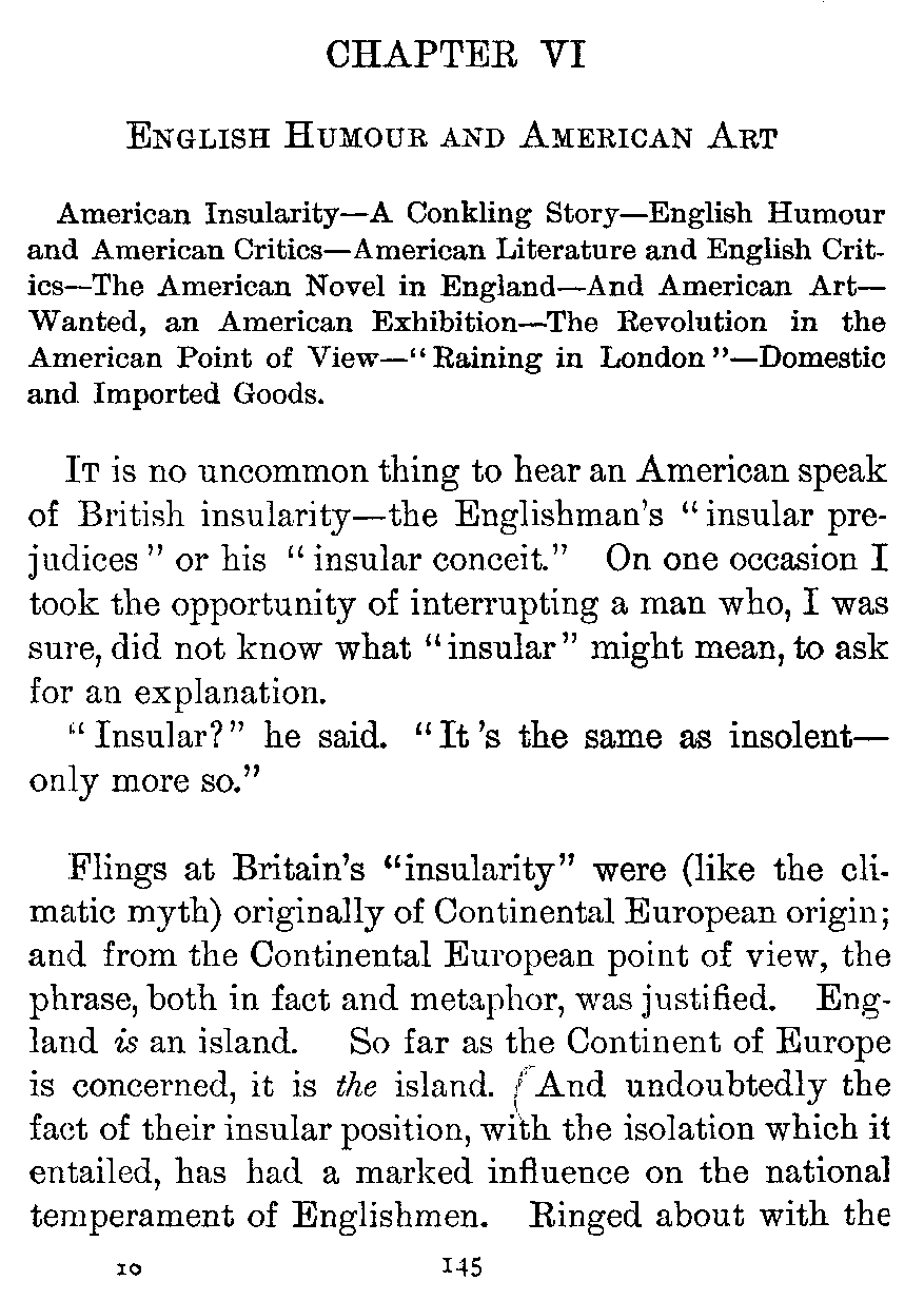 American Insularity—A Conkling Story—English Humour and American Critics—American Literature and English Critics—The American Novel in England—And American Art—Wanted, an American Exhibition[ix]—The Revolution in the American Point of View—"Raining in London"—Domestic and Imported Goods. |